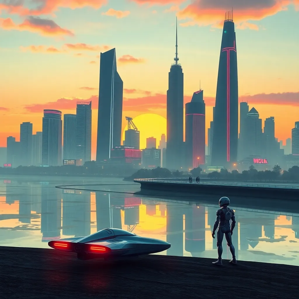 Create a futuristic cityscape at sunset, with sleek skyscrapers and neon lights reflecting off a calm, polluted lake. Incorporate a flying car or drone in the foreground, with a humanoid robot standing on the shore, gazing out at the city. Vibrant colors and bold textures, with a sense of nostalgia and wonder.