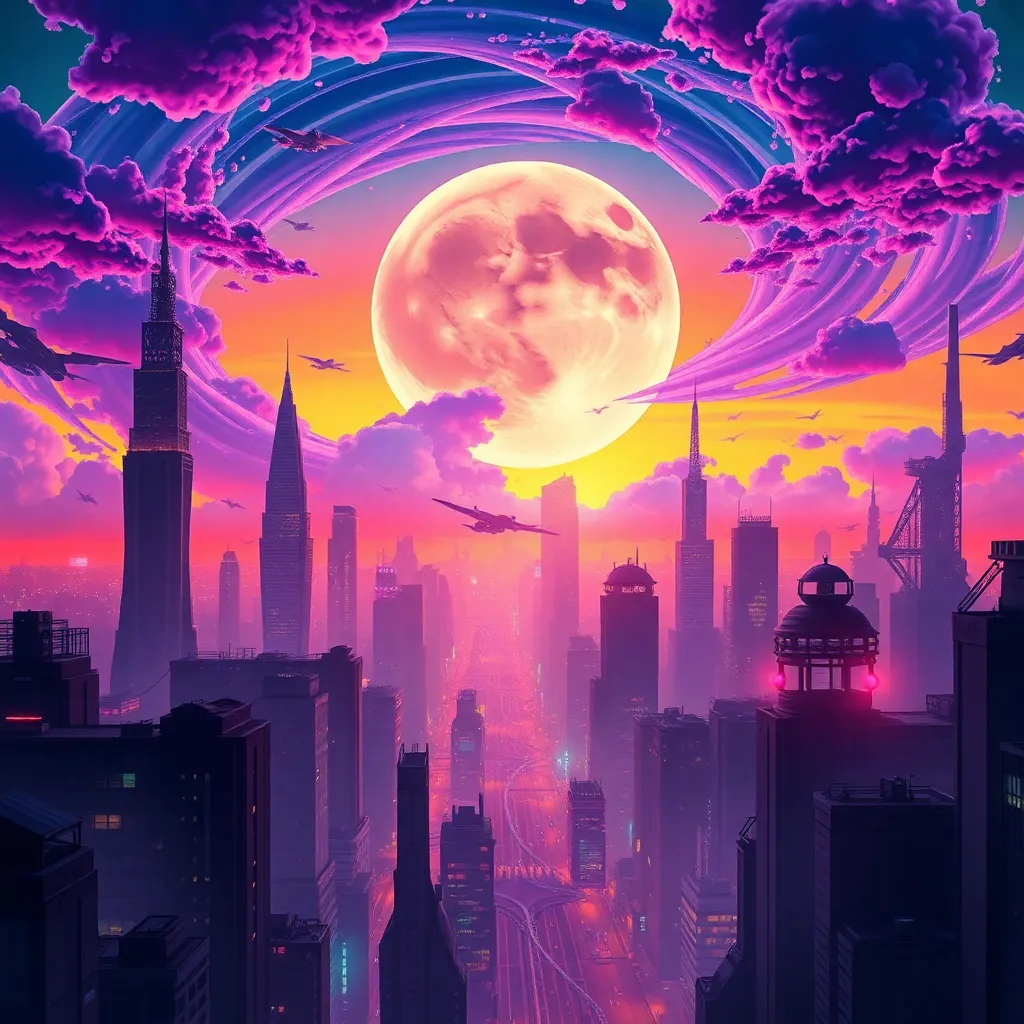Create a futuristic cityscape at sunset with towering skyscrapers, flying cars, and a vibrant neon-lit atmosphere. Incorporate a massive, glowing moon hovering above the city, surrounded by a swirling vortex of purple and blue clouds. Add subtle hints of steam punk architecture and a sense of dynamic energy.