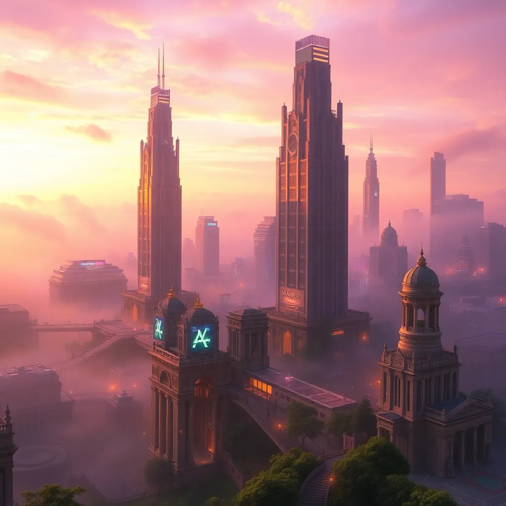 Create an ethereal cityscape at sunset, with towering skyscrapers and winding streets, surrounded by a swirling mist of purple and gold hues. Incorporate futuristic elements, such as neon lights and holographic advertisements, blending seamlessly with ancient architecture and lush greenery. The atmosphere should be dreamy and mystical.