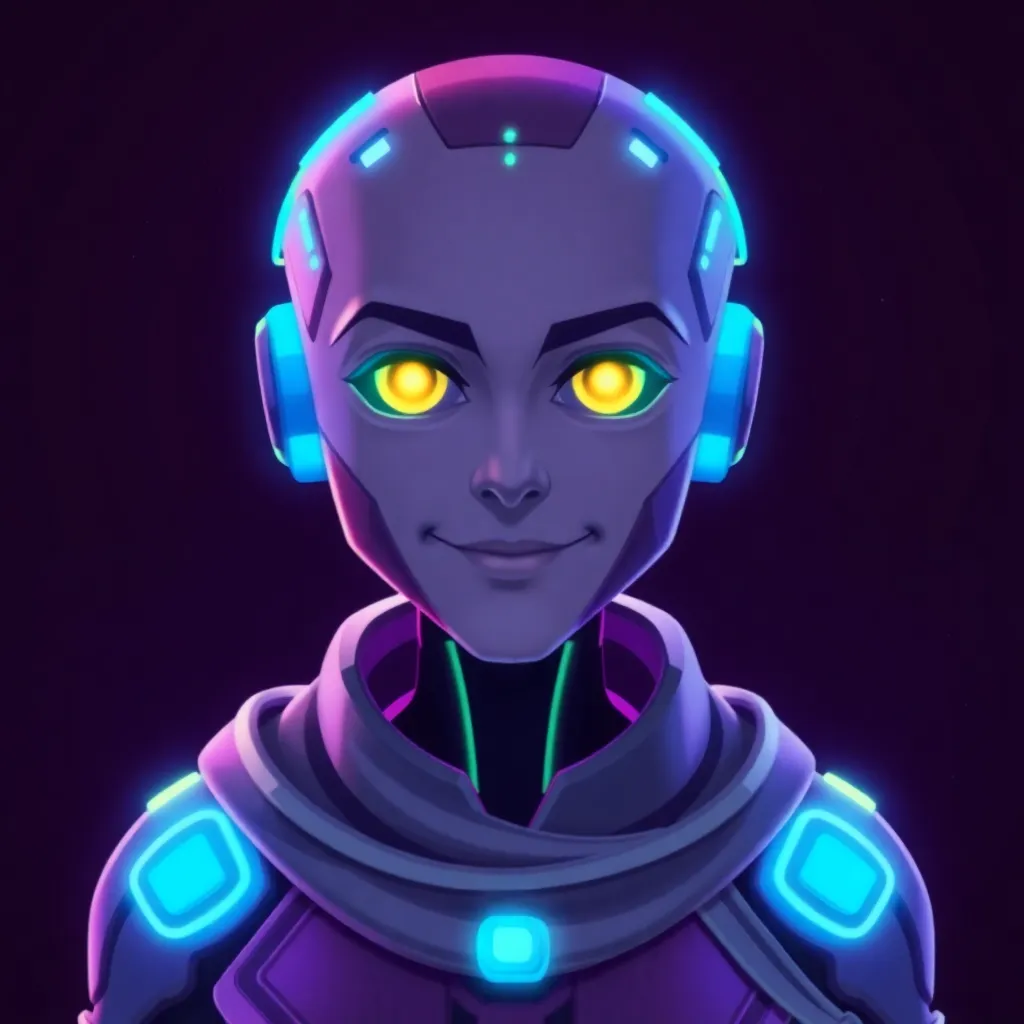 Create a futuristic AI avatar with glowing blue circuits and neon green accents, set against a dark purple background with subtle starfield texture. The avatar should have a confident and intelligent expression, with piercing yellow eyes and a slight smile. Incorporate a flowing, metallic cape with intricate wiring patterns.