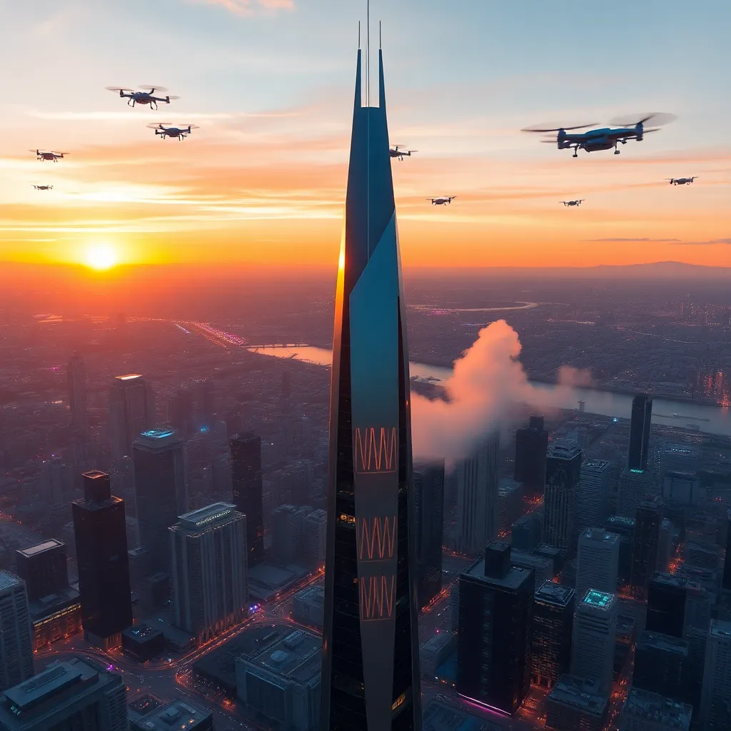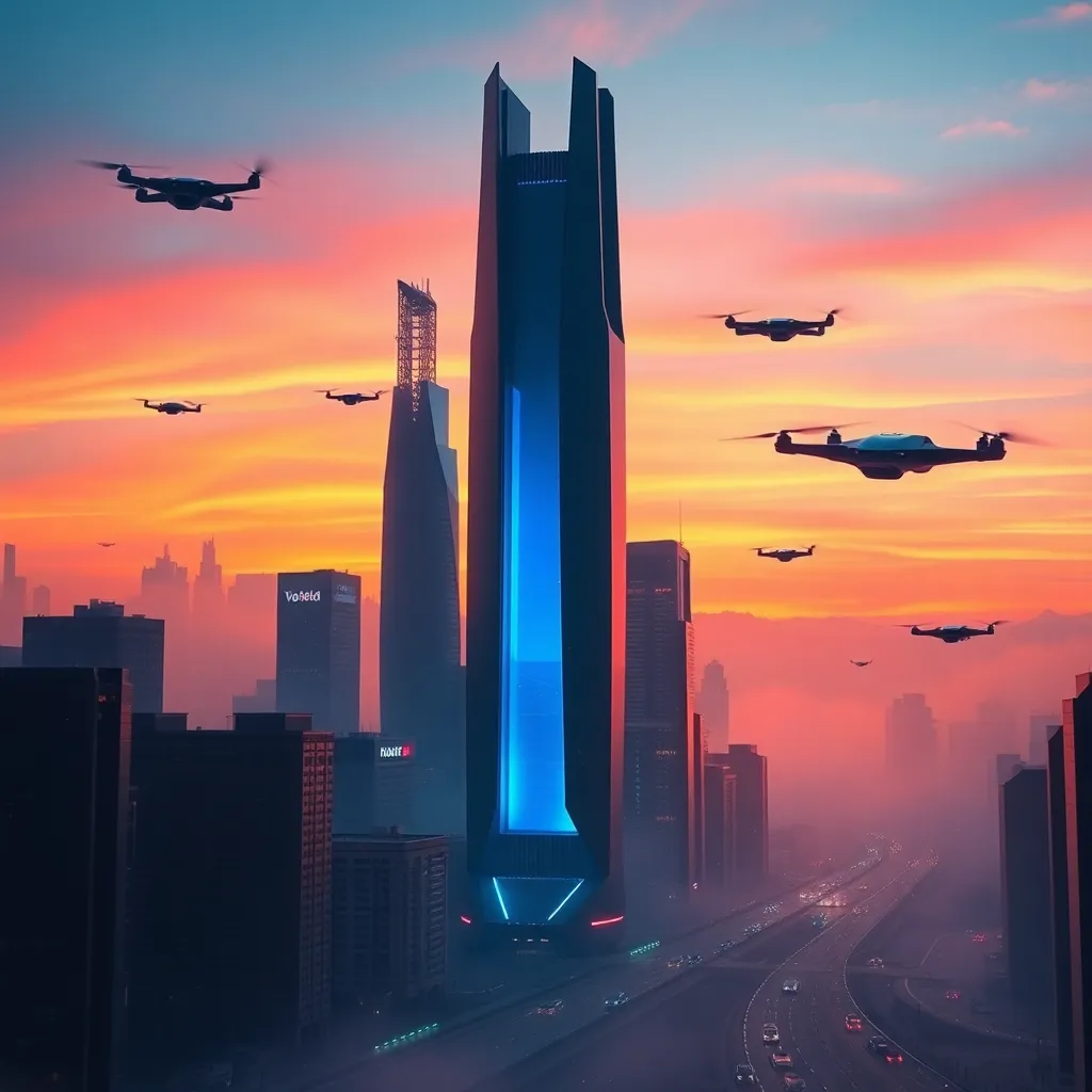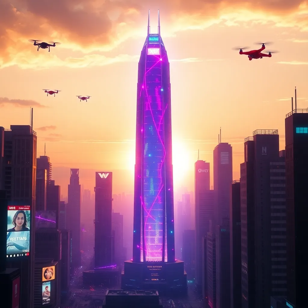 Create a futuristic cityscape at sunset with a glowing, iridescent skyscraper in the center. The building should be surrounded by a swirling aura of purple and blue lights. Incorporate holographic advertisements and flying drones. The background should be a warm, golden hue with subtle wisps of cloud.