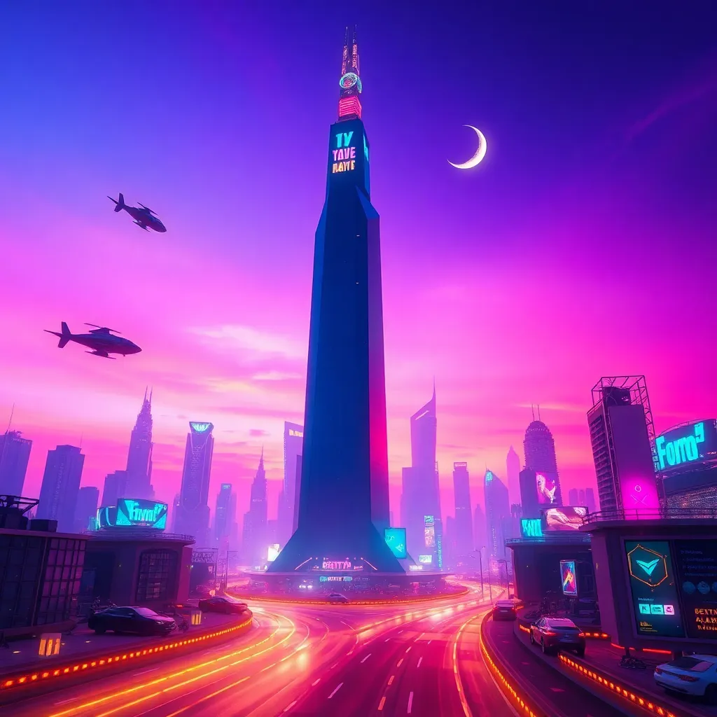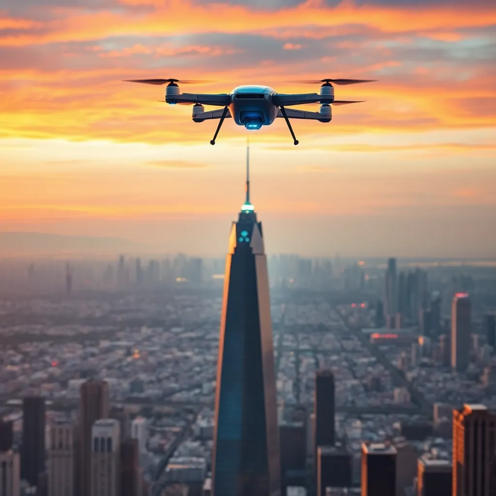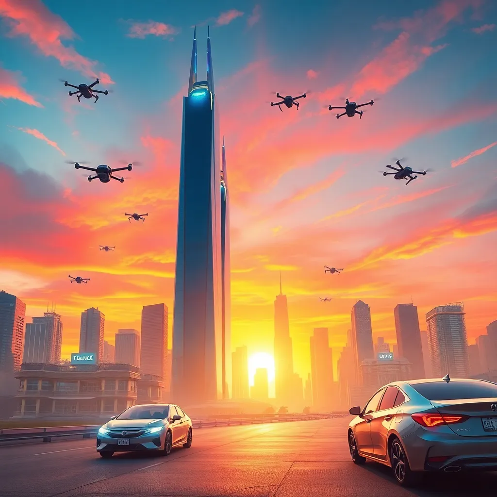 Create a futuristic cityscape at sunset with a glowing, iridescent skyscraper in the center. The building should be surrounded by a swirling aura of purple and blue lights. Incorporate holographic advertisements and flying drones. The background should be a warm, golden hue with subtle wisps of cloud.