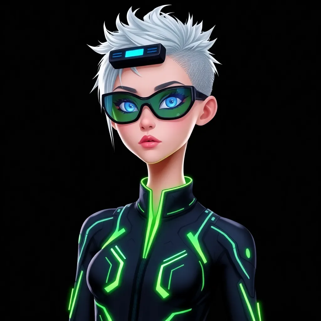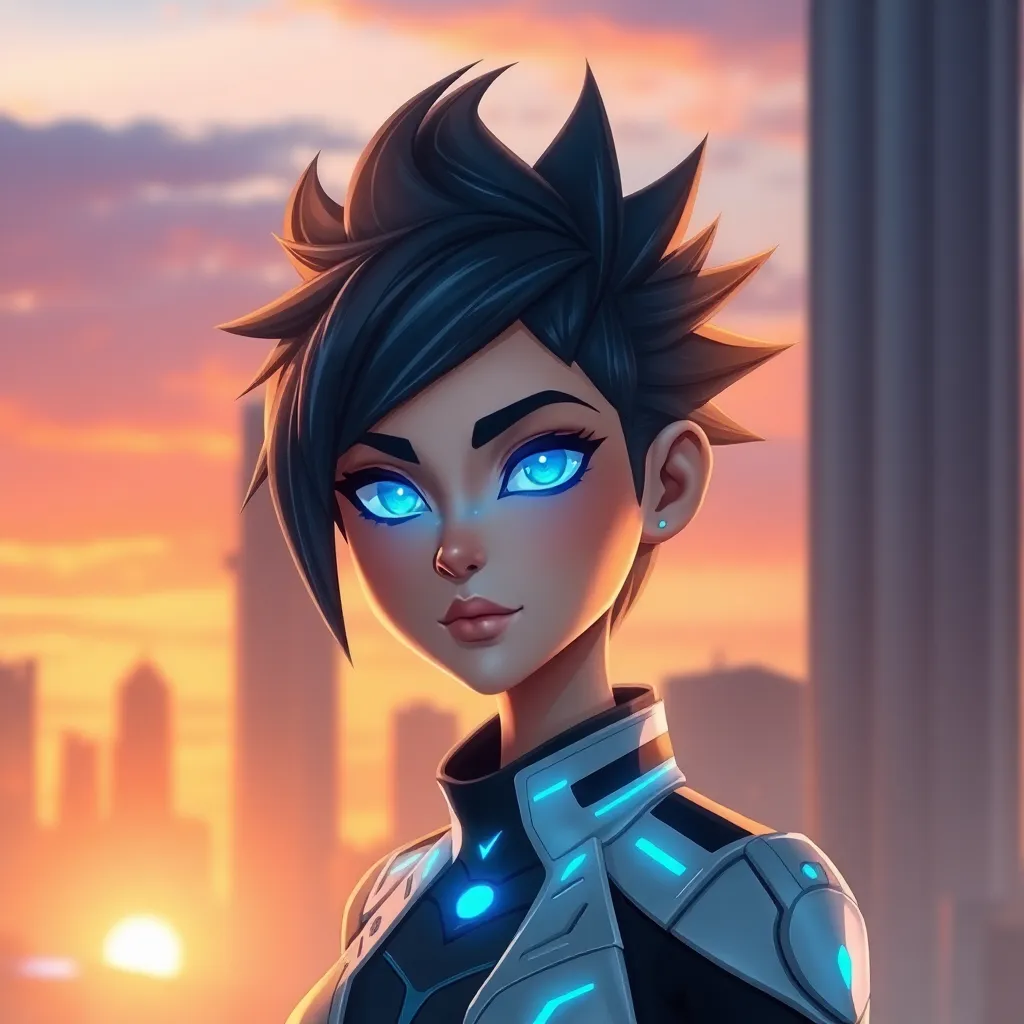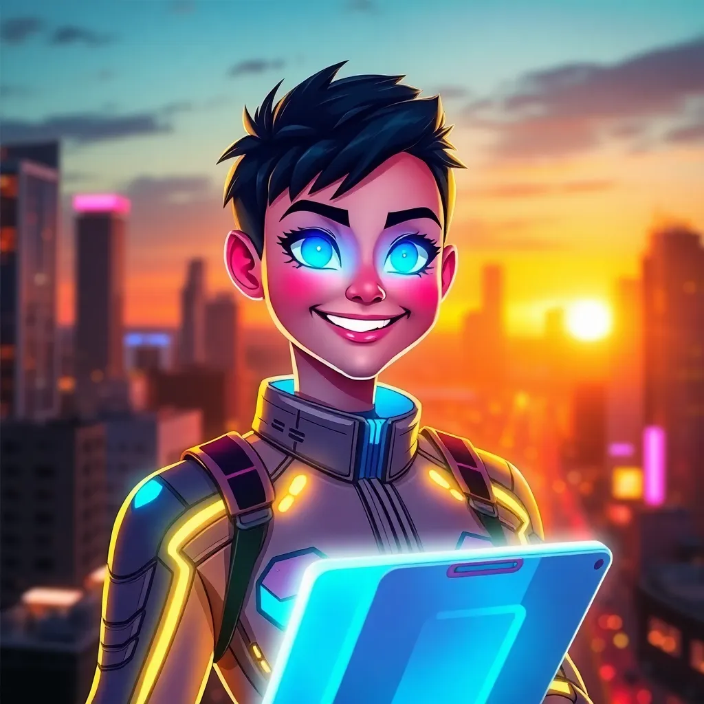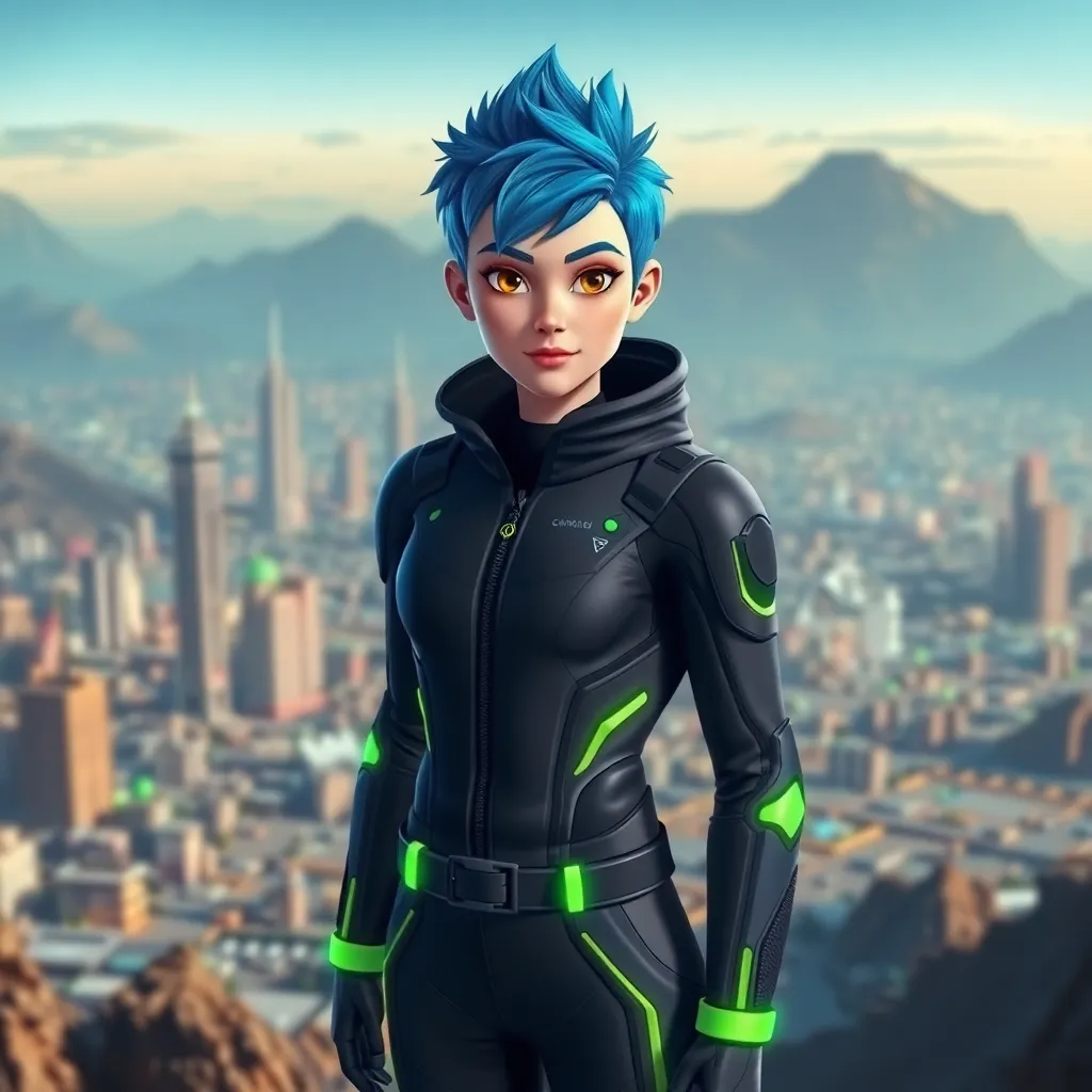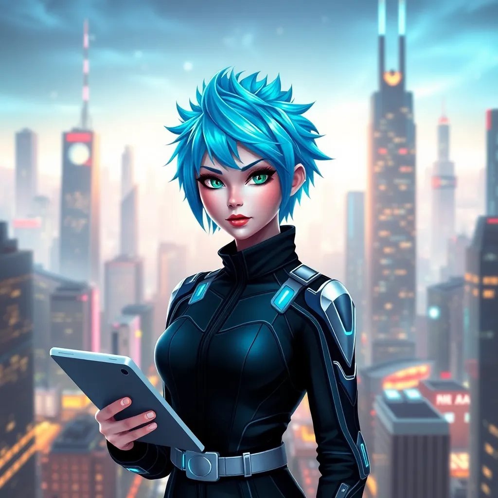 Create a futuristic avatar with a futuristic cityscape in the background. The avatar should be a young woman with short, spiky blue hair and piercing green eyes. She should be wearing a sleek black jumpsuit with a silver utility belt and holding a holographic tablet. The cityscape should be a blend of neon lights and towering skyscrapers.