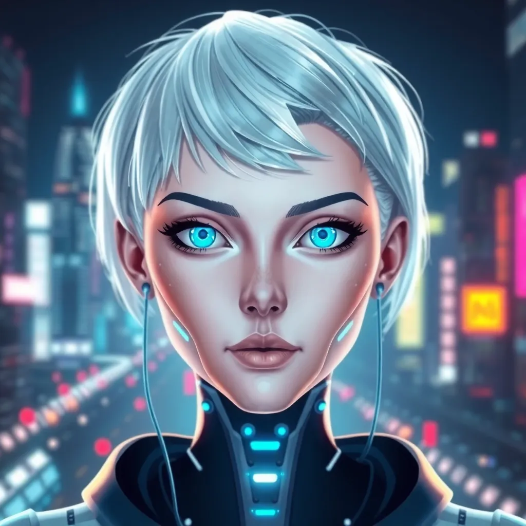 Create a futuristic-looking AI avatar with a neon-lit cityscape background. The avatar should have piercing blue eyes, short silver hair, and a confident expression. Incorporate glowing circuits and wires into the design. Give the avatar a sleek, high-tech appearance, with a hint of mystery and a futuristic vibe.