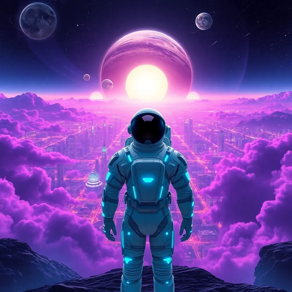 Create an AI-generated image of a futuristic astronaut standing in front of a sprawling, neon-lit cityscape on a distant planet, wearing a sleek white and silver spacesuit with glowing blue accents, surrounded by swirling clouds of purple gas and stars. The astronaut should be looking up at the planet's triple suns.