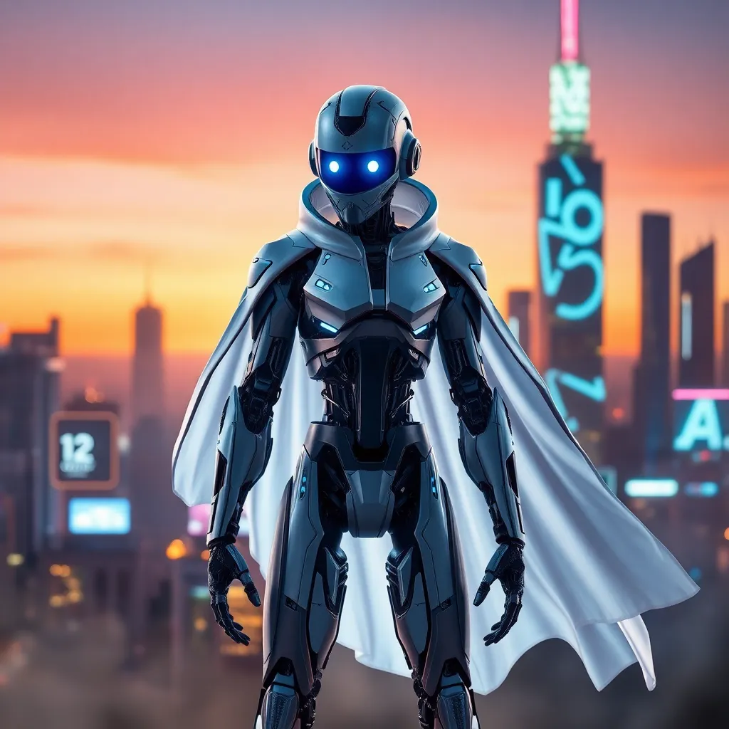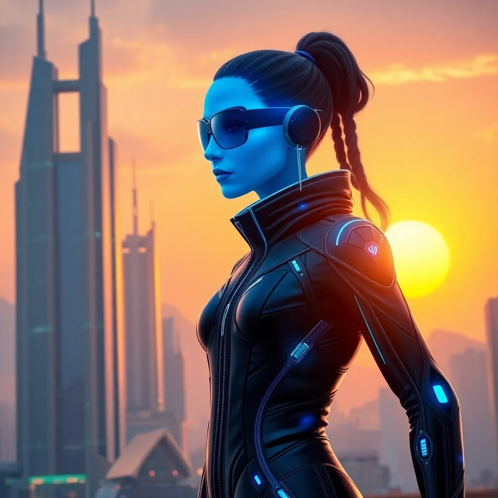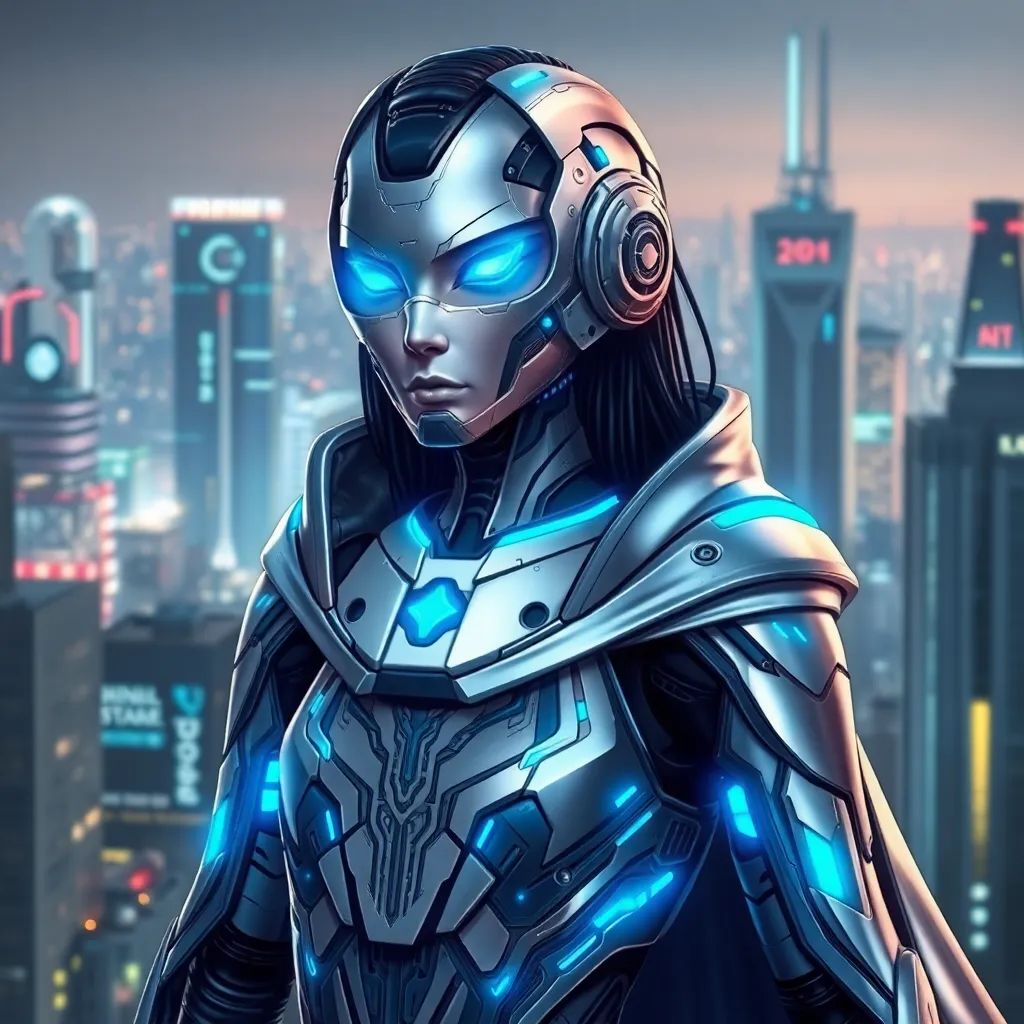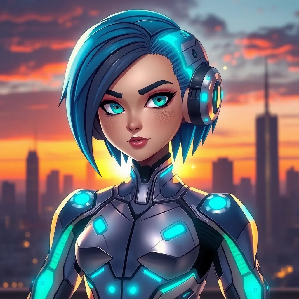Create a futuristic avatar with a bold, cyberpunk-inspired design. The character should have a sleek, metallic body with glowing blue circuits and neon-green accents. They should be standing in front of a cityscape at sunset, with a confident and determined expression. Incorporate subtle holographic effects and a futuristic energy aura.