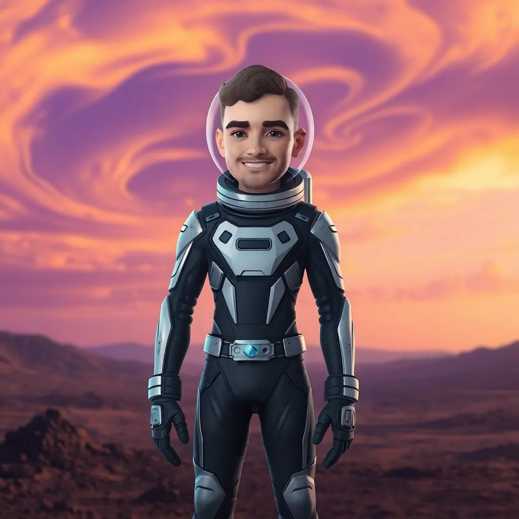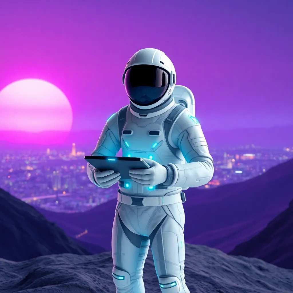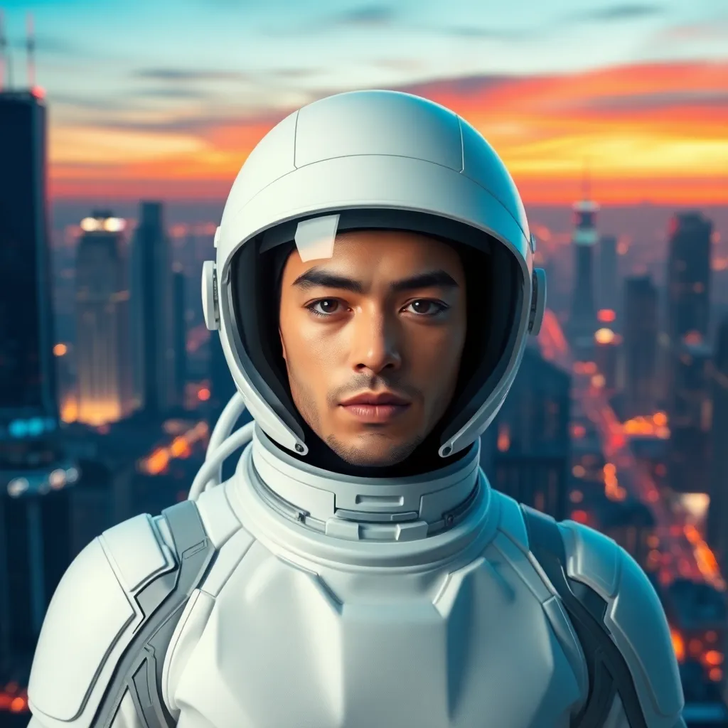 Create an AI-generated avatar of a futuristic astronaut, standing in front of a neon-lit cityscape at sunset. The astronaut should wear a sleek white spacesuit with a silver helmet, and have a determined expression. The cityscape should be a vibrant blend of colors, with towering skyscrapers and flying cars.