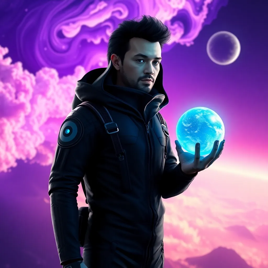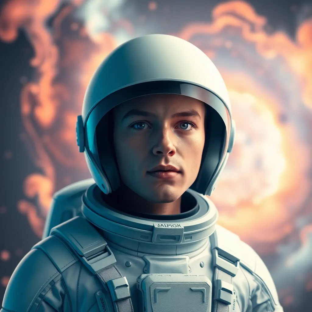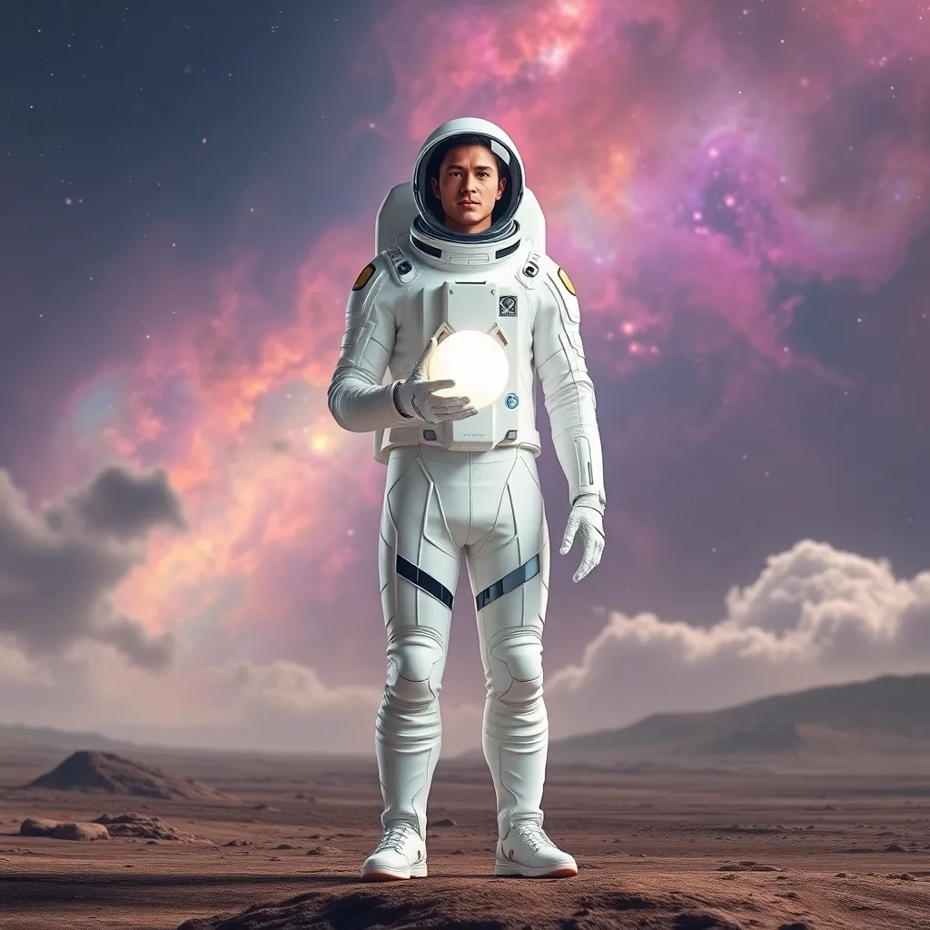 Create an AI-generated image of a futuristic astronaut standing on a distant planet, wearing a sleek white spacesuit and holding a glowing orb. The background should feature a stunning nebula with vibrant colors and swirling clouds of gas. The astronaut's expression should convey a sense of wonder and discovery.
