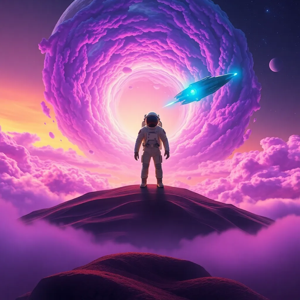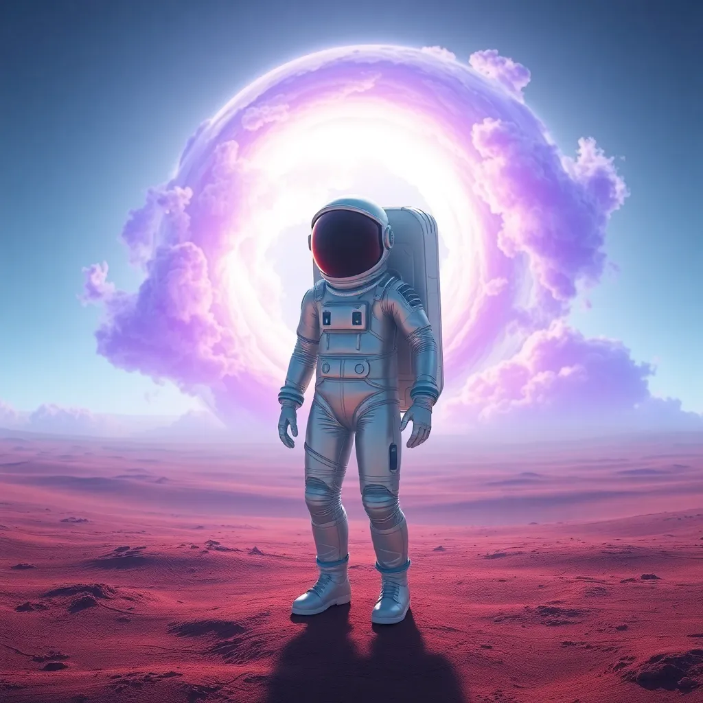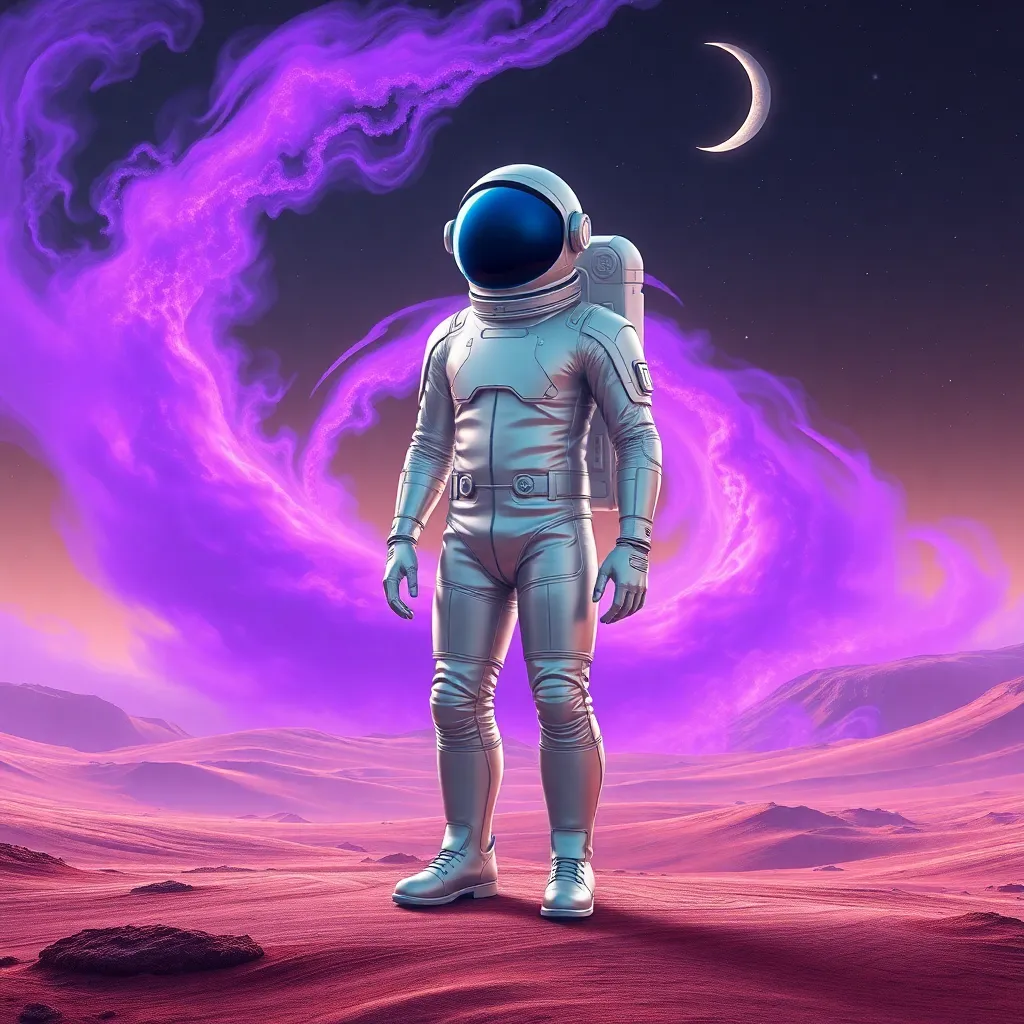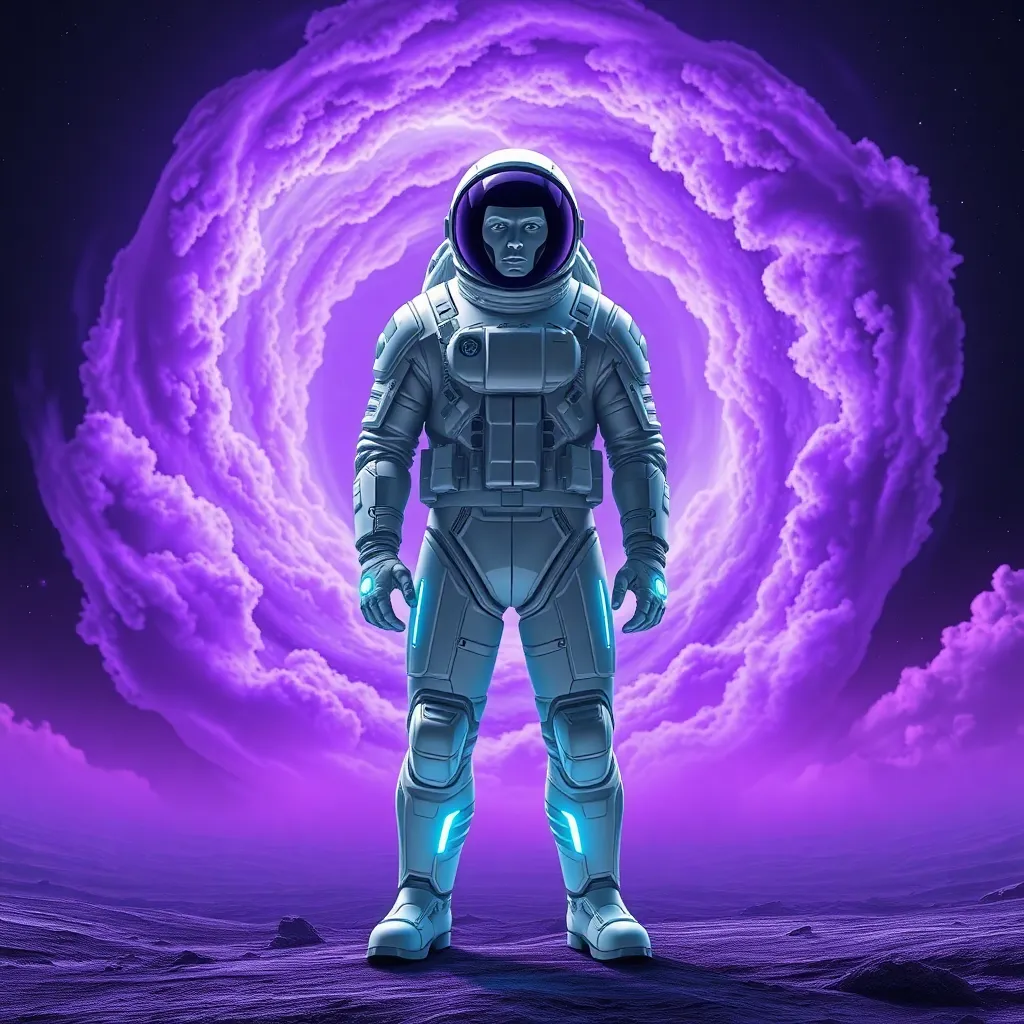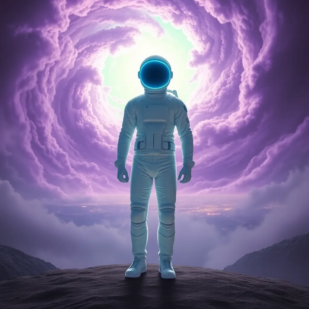 Create an AI-generated image of a futuristic astronaut standing on a distant planet, wearing a sleek white spacesuit with a glowing blue visor, surrounded by a swirling vortex of purple and green clouds, with a distant cityscape in the background and a faint glow of stars shining through the atmosphere.