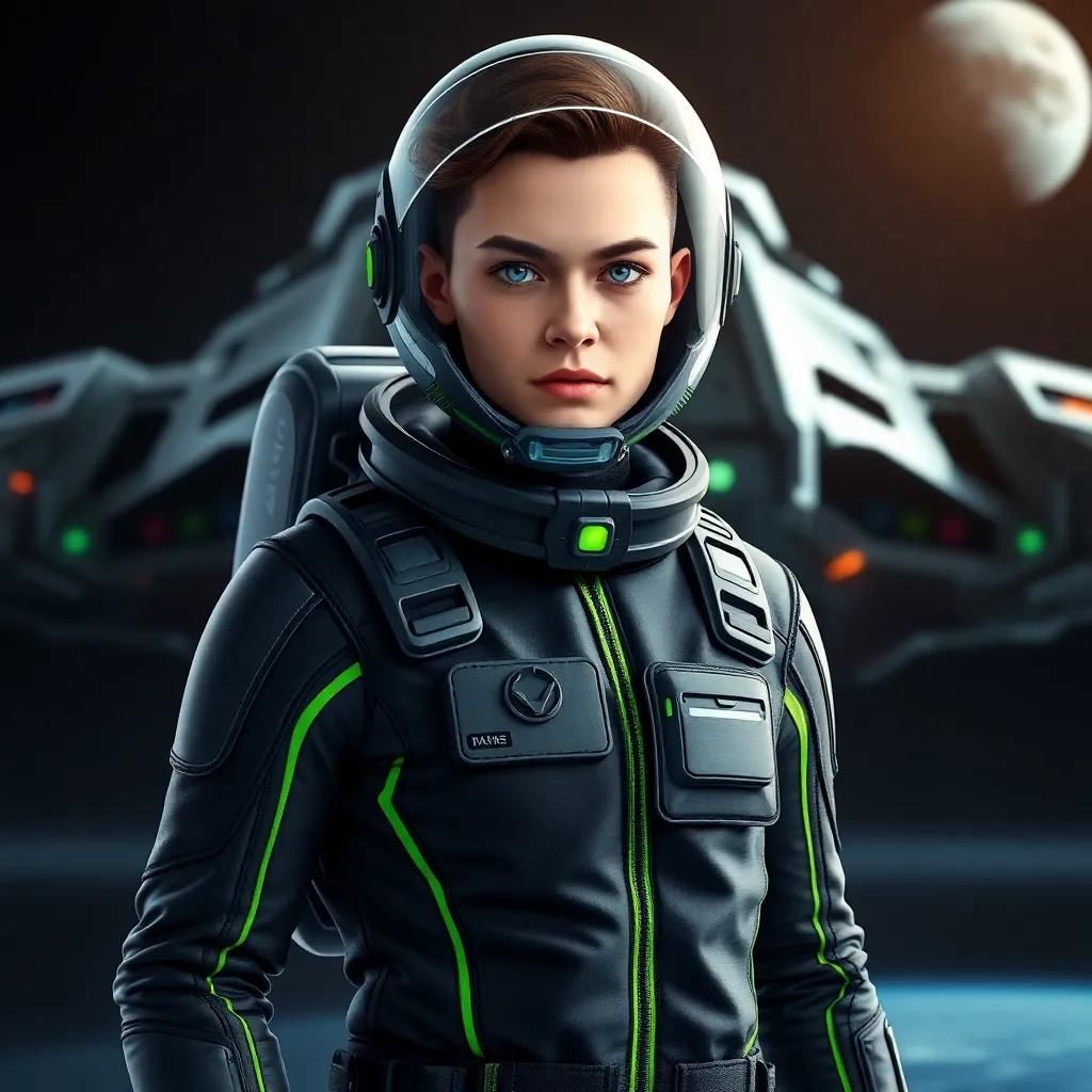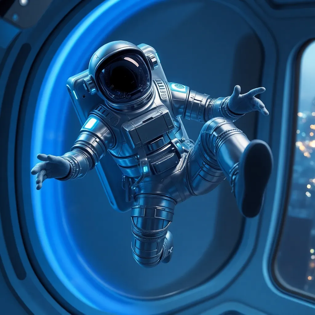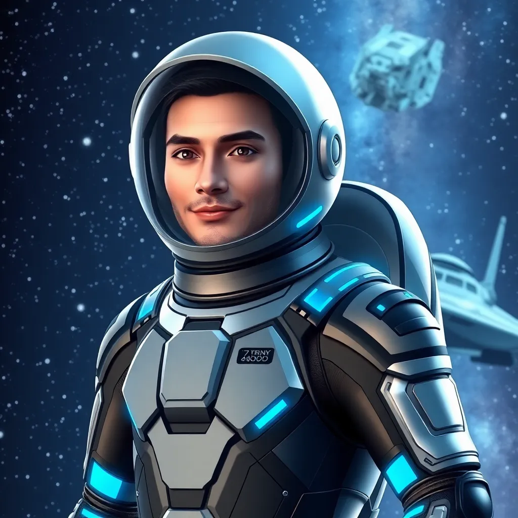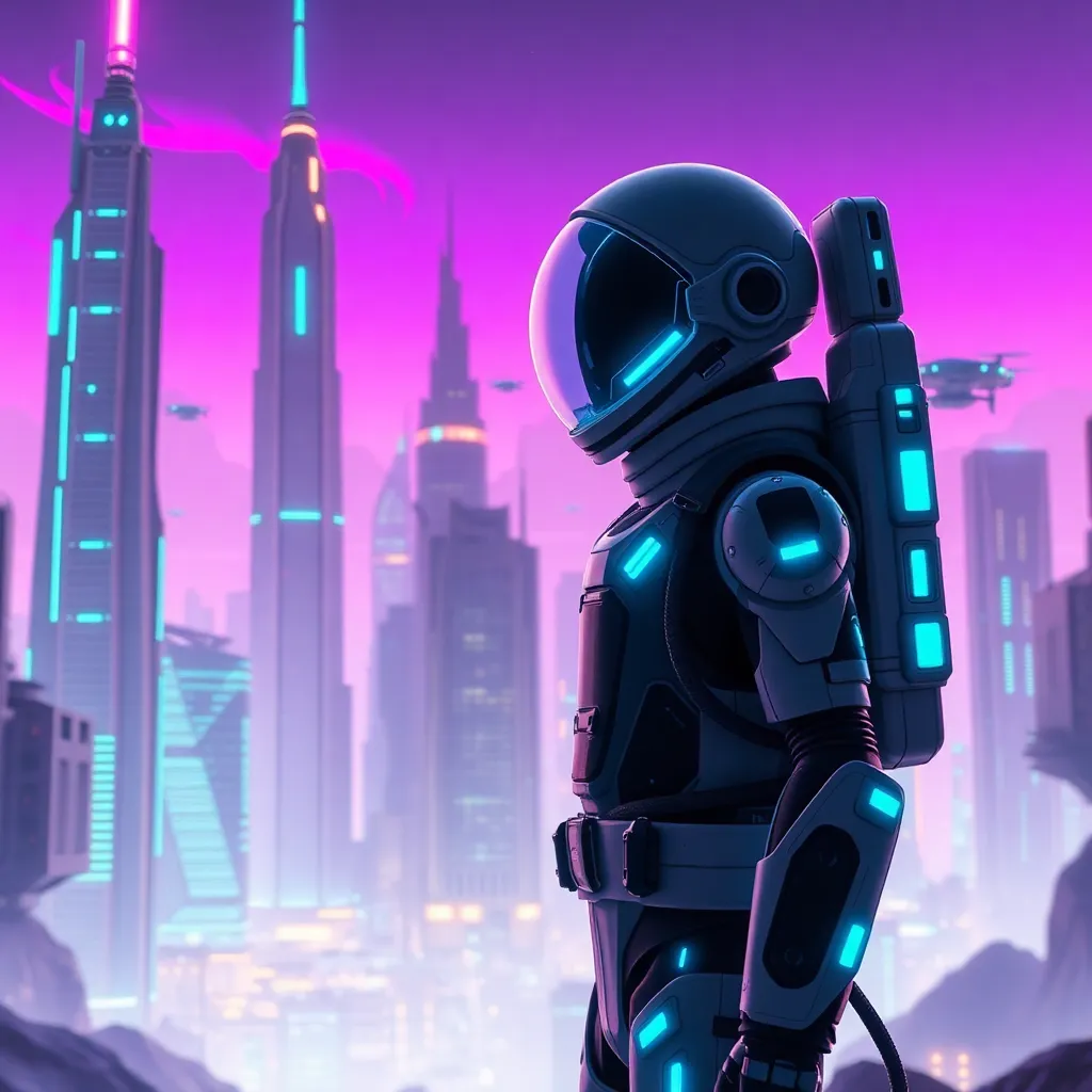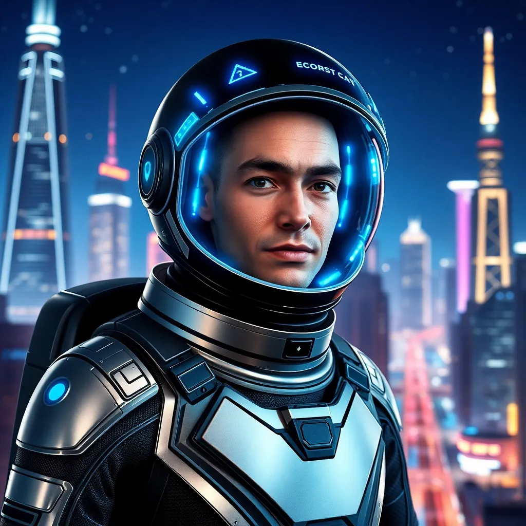 Create an AI-generated avatar of a futuristic astronaut wearing a sleek black and silver spacesuit, with a helmet adorned with glowing blue circuits and a confident expression. The astronaut should be standing in front of a vibrant, neon-lit cityscape with towering skyscrapers and a starry night sky.