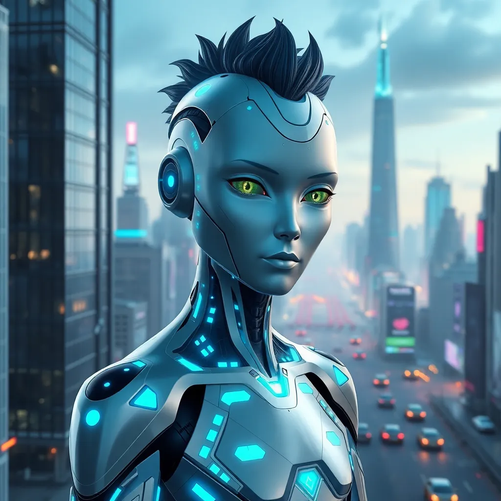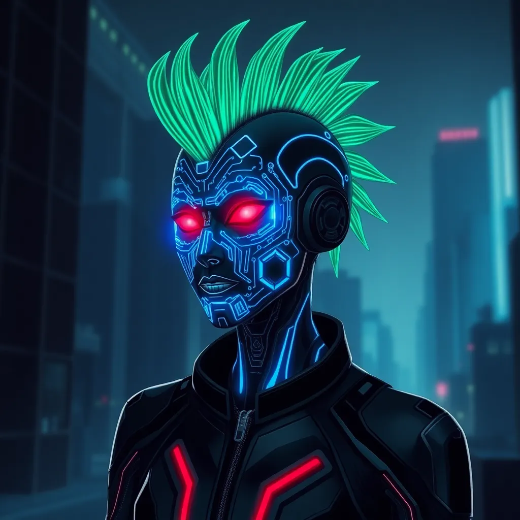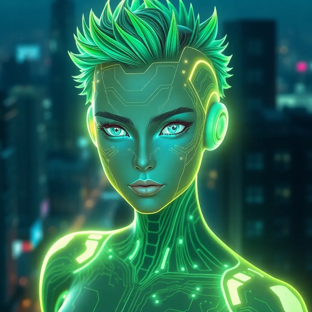 Create a futuristic AI avatar with a mesmerizing glow. The avatar should have piercing blue eyes, short spiky hair with neon green tips, and a slender yet athletic build. Incorporate intricate circuitry patterns on the skin and a subtle aura of energy surrounding the figure. Generate an image with a cityscape background.