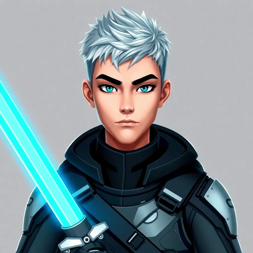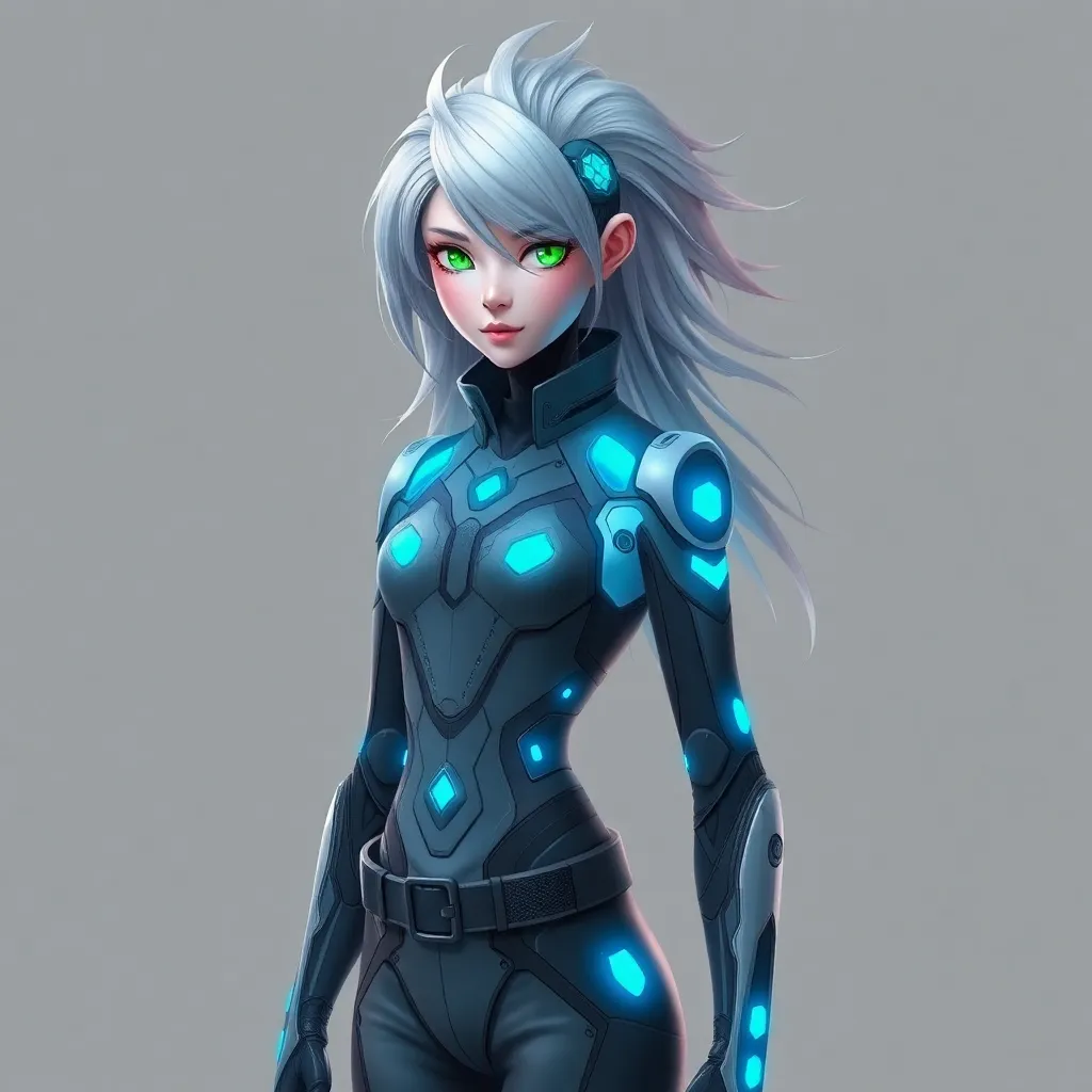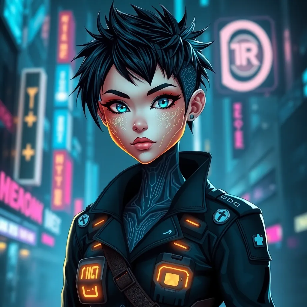 Create a futuristic, cyberpunk-inspired avatar with a mix of human and robotic features. The avatar should have piercing blue eyes, short spiky hair, and metallic skin with glowing circuitry patterns. Dress the avatar in a sleek black jumpsuit with neon accents and a utility belt. Set against a dark, neon-lit cityscape.