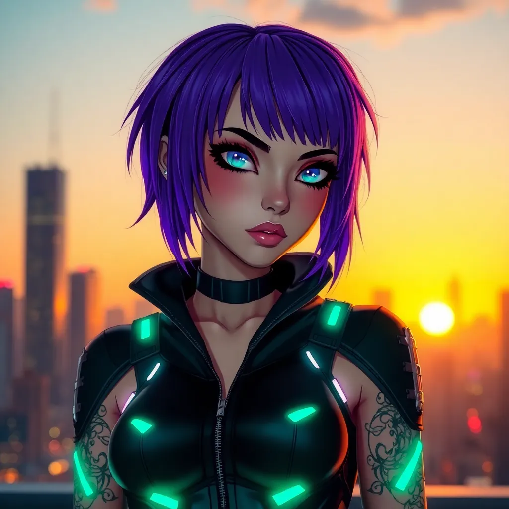 Create a futuristic, neon-lit avatar with a cyberpunk aesthetic. The character should have piercing blue eyes, short purple hair, and a series of intricate, glowing tattoos on their arms. They should be dressed in a sleek black jumpsuit with metallic accents, standing in front of a cityscape at sunset.