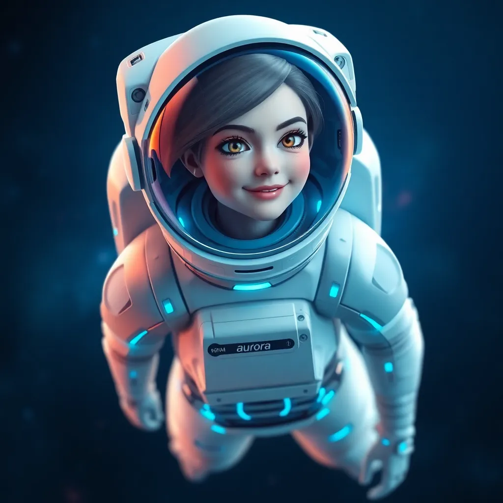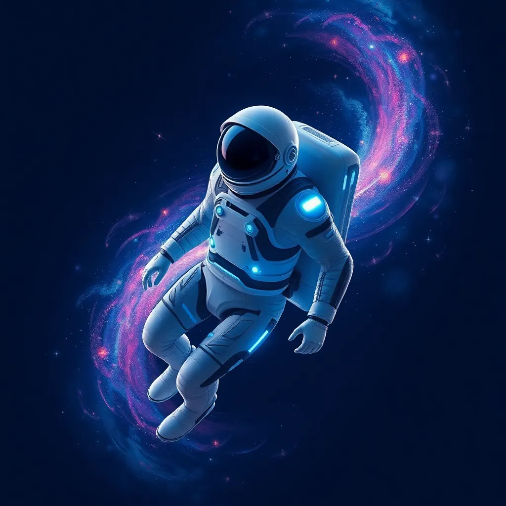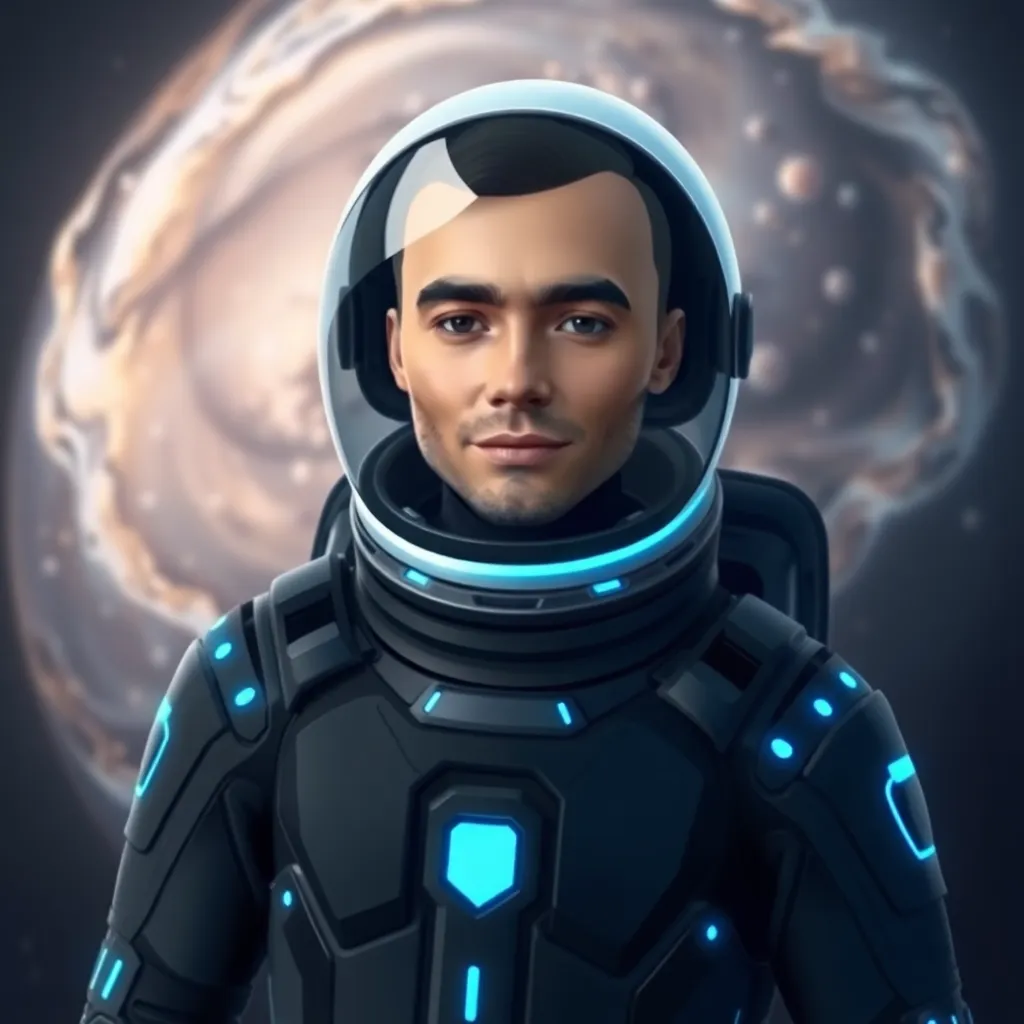 Create an AI-generated avatar of a futuristic astronaut, dressed in a sleek black spacesuit with glowing blue accents, standing in front of a swirling nebula background. Incorporate subtle texture and shading to give the image a sense of depth and dimensionality. The astronaut's face should be expressive and confident.
