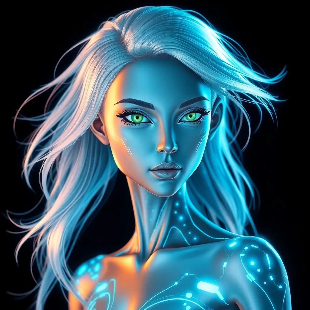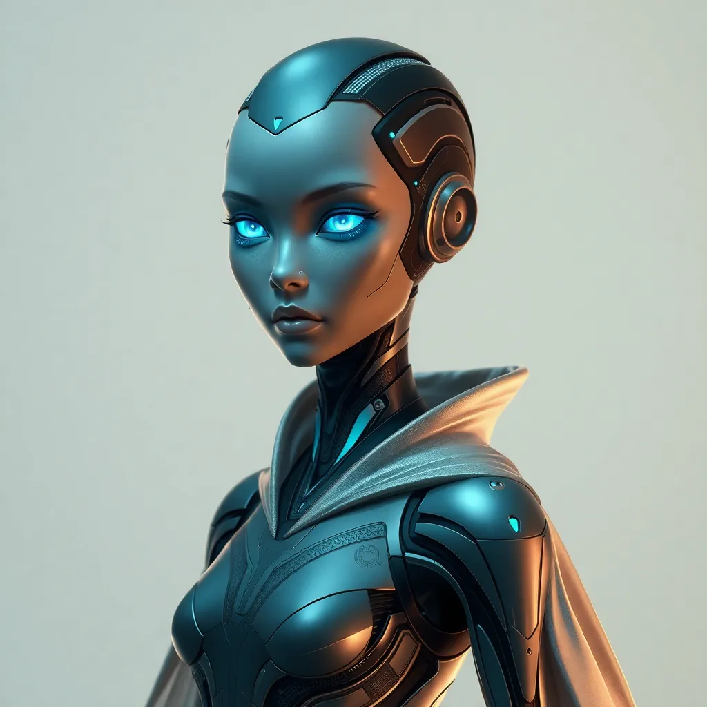 Create a futuristic AI avatar with a slender, androgynous face, glowing blue eyes, and a sleek, metallic body with intricate circuitry patterns. The avatar should be dressed in a flowing, iridescent cloak with a subtle shimmer effect. Incorporate subtle lighting and shading to give the image depth and dimension.