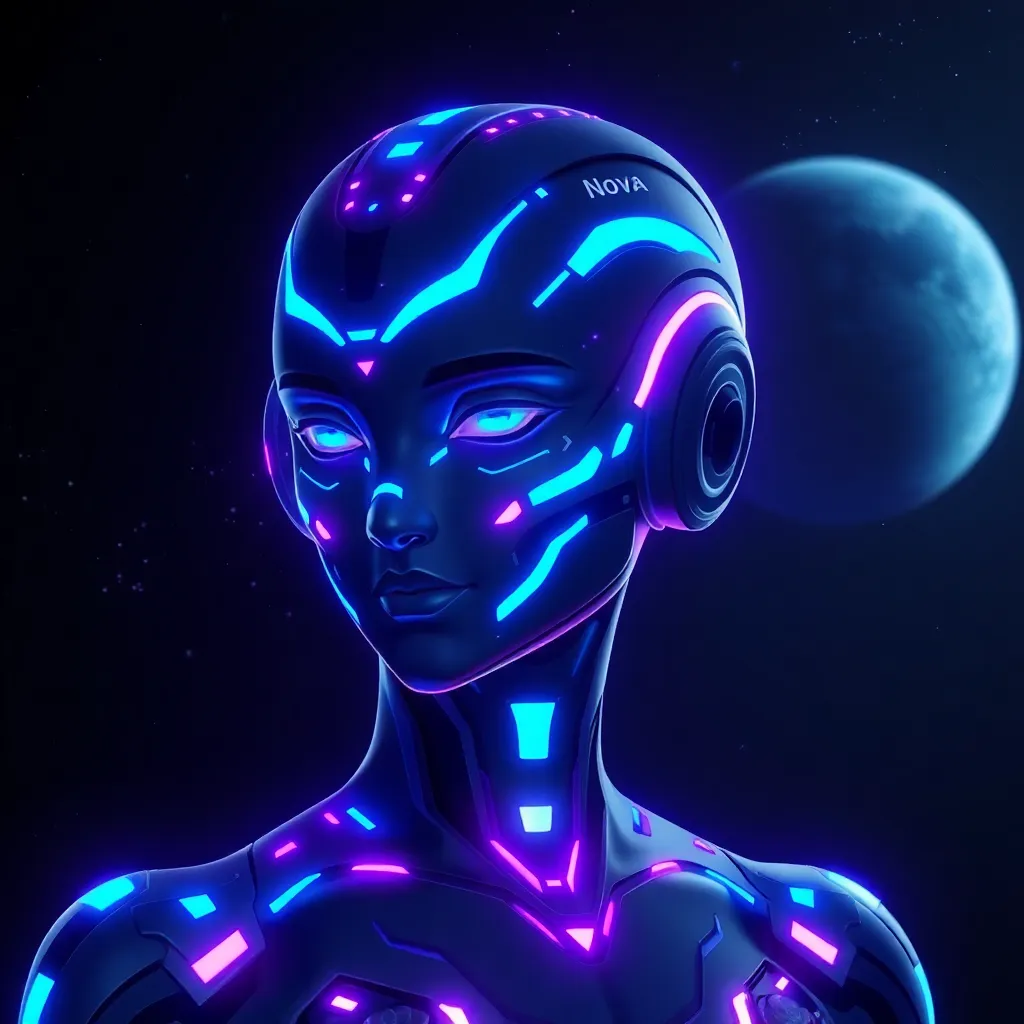 Create a futuristic AI avatar named 'Nova' with glowing blue circuits and neon purple accents. Nova should have a sleek, high-tech aesthetic with a hint of organic curves. Incorporate subtle LED lights and a mesmerizing aura surrounding the character. The background should be a dark, starry night sky with a distant planet.