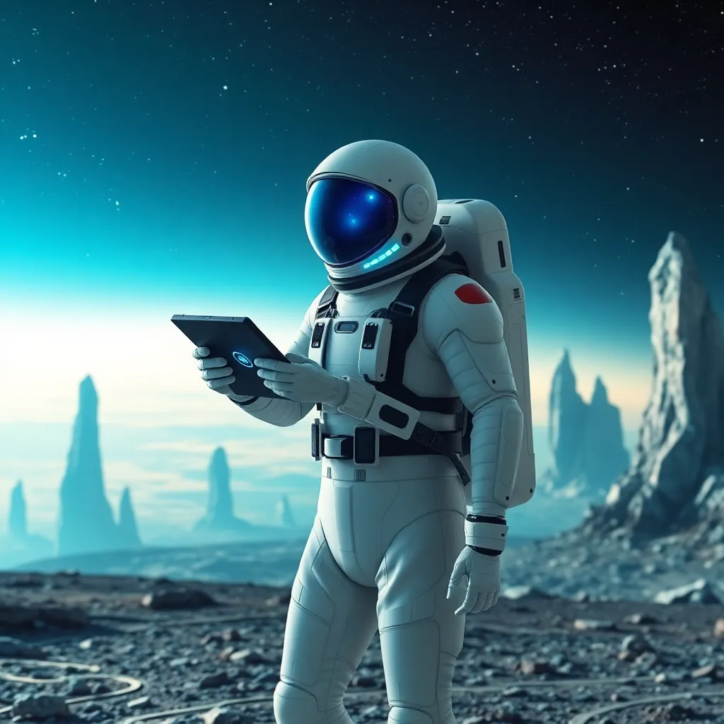 Create an AI-generated avatar of a futuristic astronaut exploring a distant planet's surface. The astronaut should be wearing a sleek, high-tech spacesuit with a glowing blue visor and holding a holographic tablet. The planet's terrain should feature towering crystal formations and a vast, starry sky.