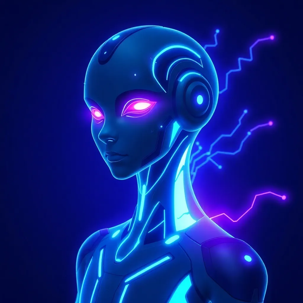 Create a futuristic AI avatar with glowing blue circuits and a mesmerizing purple aura. The avatar should have a sleek, humanoid body with sharp lines and a mysterious gaze. Incorporate subtle neon accents and a wispy, ethereal trail behind it. The overall design should exude innovation, intelligence, and otherworldly appeal.