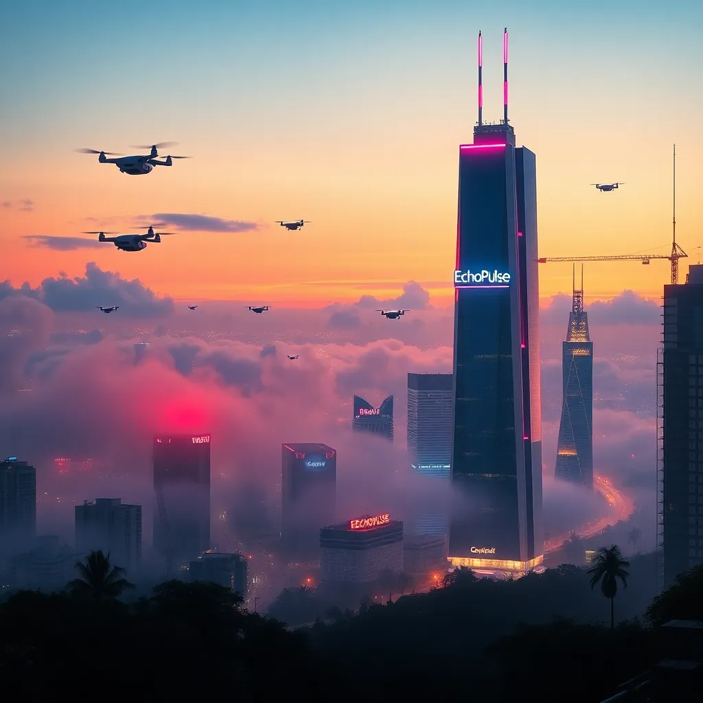 Create an AI-generated image of a futuristic cityscape at dusk, featuring a sleek skyscraper with a glowing neon sign reading 'EchoPulse', surrounded by hovering drones and a wispy fog. Incorporate vibrant colors and intricate details, blending organic and synthetic elements to evoke a sense of wonder and technological advancement.