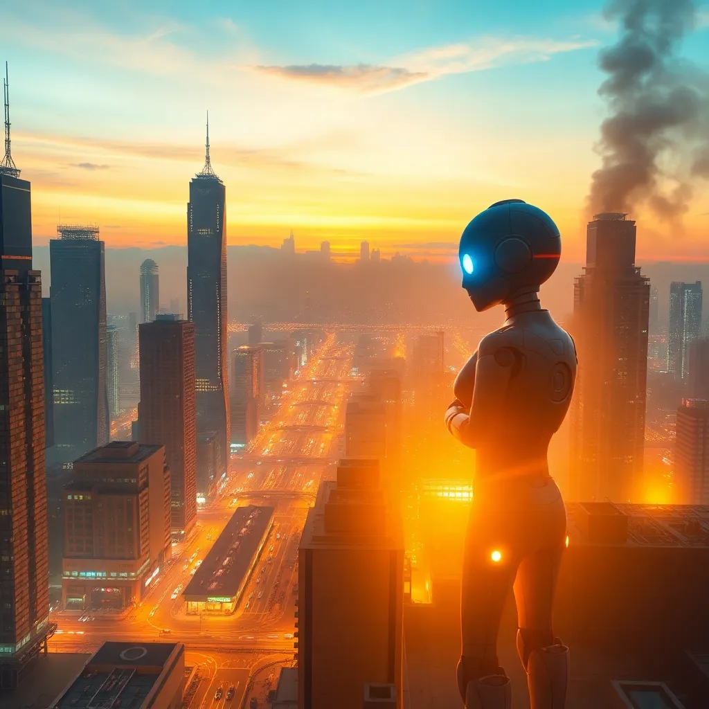 Create an AI-generated image of a futuristic cityscape at sunset, with towering skyscrapers, neon-lit streets, and a hint of smoke rising from the city's industrial district. Incorporate a humanoid robot standing atop a skyscraper, gazing out at the horizon with a glowing blue eye, surrounded by a warm orange glow.