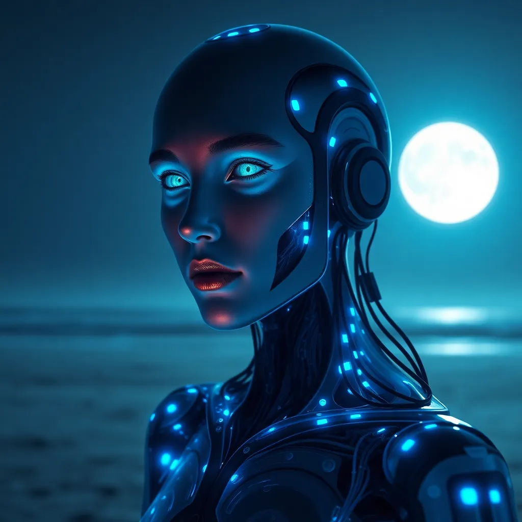 Create an AI-generated image of a futuristic cyborg standing on a moonlit beach, with glowing blue circuits and wires visible beneath their translucent skin. The cyborg's face is a mix of human and robotic features, with piercing green eyes that seem to stare into the distance. The moon is full and bright in the sky.