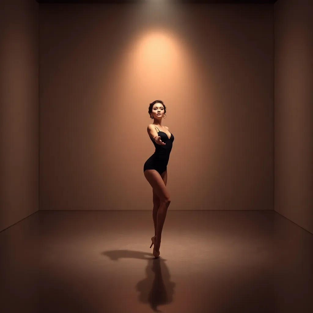 Create a stunning image of a solo dancer in a dimly lit studio. The dancer should be standing in the center of the frame, with a subtle spotlight on their face. Remove the background, leaving only a soft, gradient-colored blur. Enhance the dancer's figure and add a touch of glamour to the overall aesthetic.