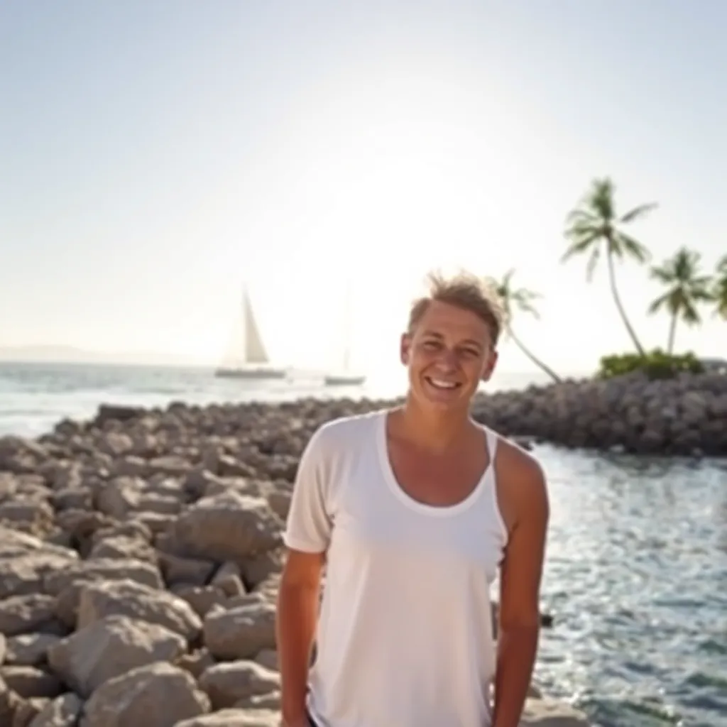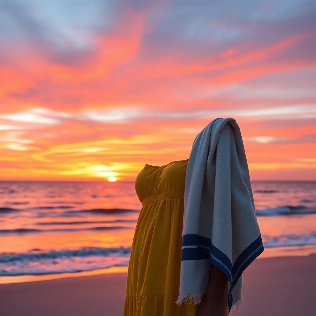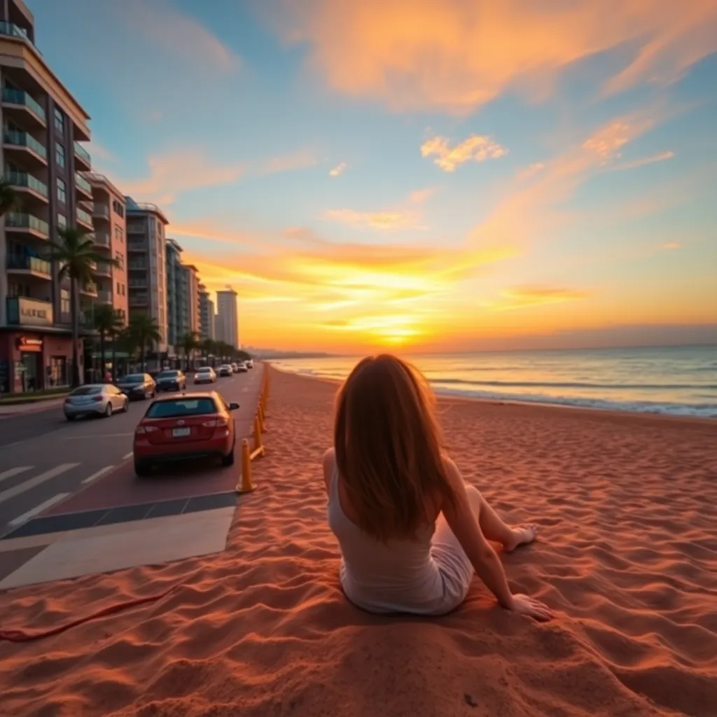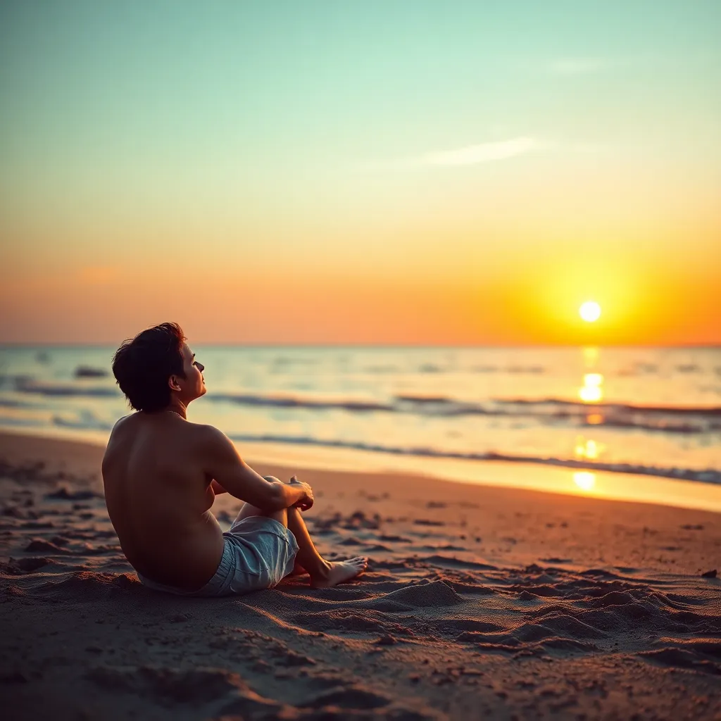 Create a stunning image of a person sitting on a beach at sunset. Remove the background, focusing on the person in the foreground. Use a warm, golden tone to capture the ambiance of the setting sun. Incorporate subtle shadows and highlights to create depth and dimensionality. The person should be relaxed and serene.