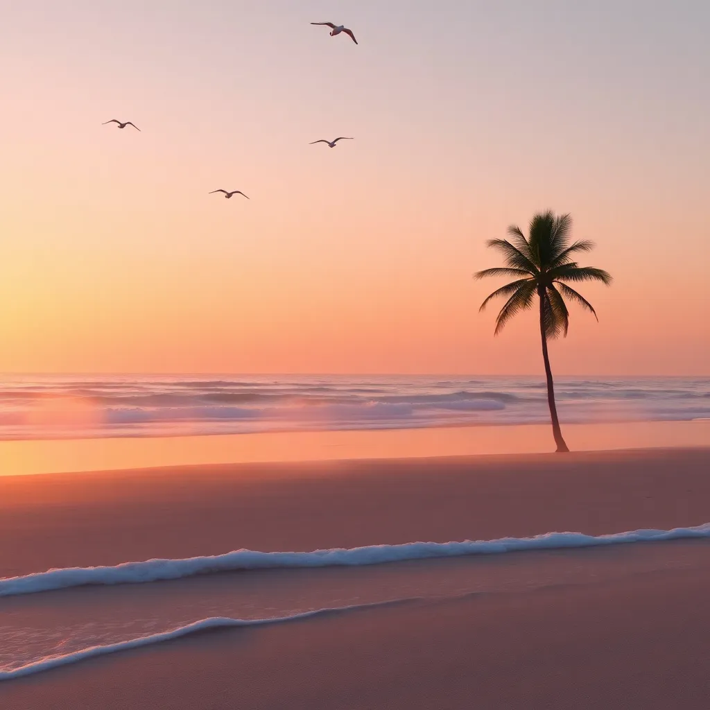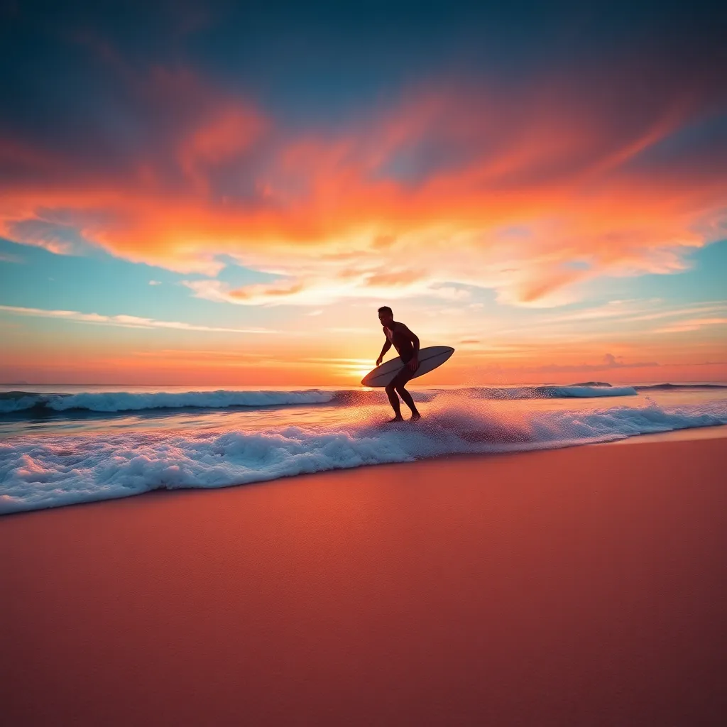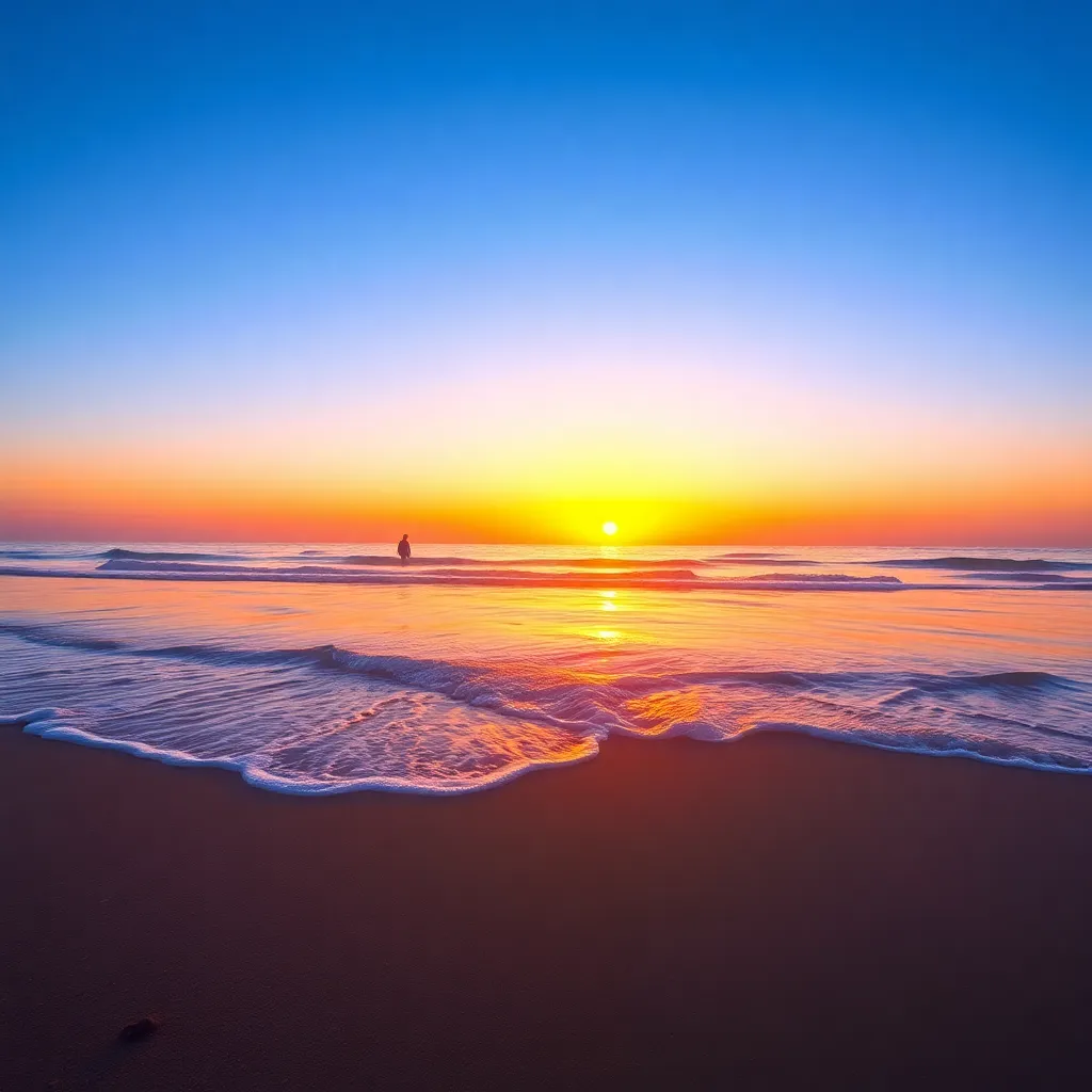 Create a stunning image of a serene beach at sunset, with a warm golden glow, gentle waves, and a silhouette of a lone figure in the distance. Remove the background and replace it with a subtle gradient of blues and purples, blending seamlessly into the sky. Use a mix of brushstrokes and textures to add depth and dimension.