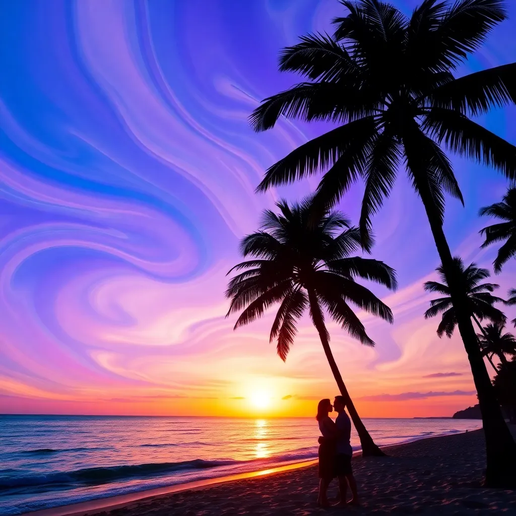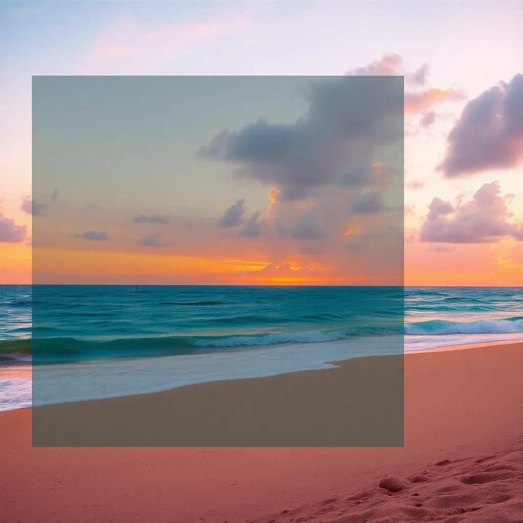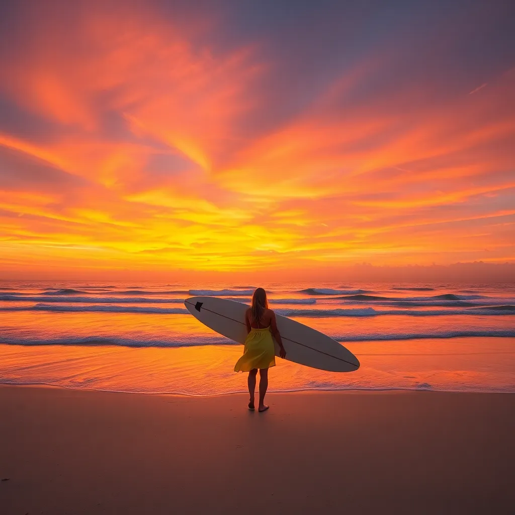 Create a stunning image of a serene beach at sunset, with a warm golden glow, gentle waves, and a silhouette of a lone figure in the distance. Remove the background and replace it with a subtle gradient of blues and purples, blending seamlessly into the sky. Use a mix of brushstrokes and textures to add depth and dimension.