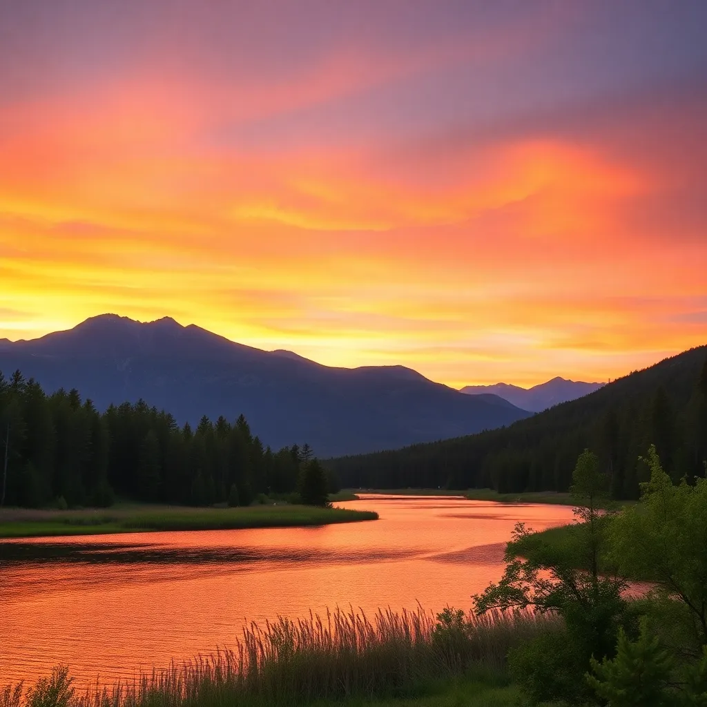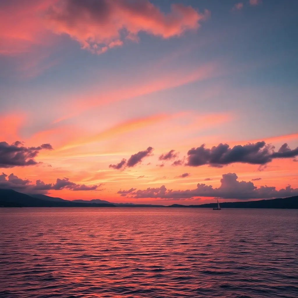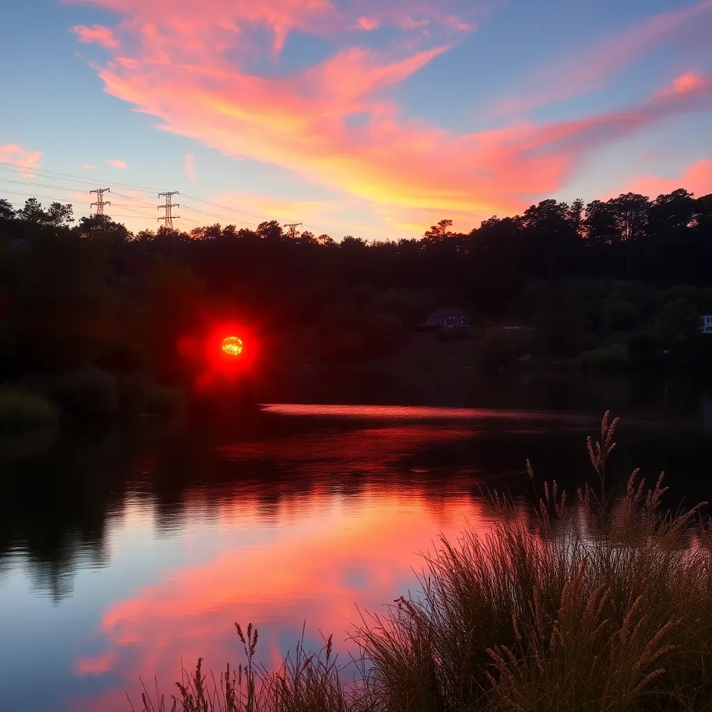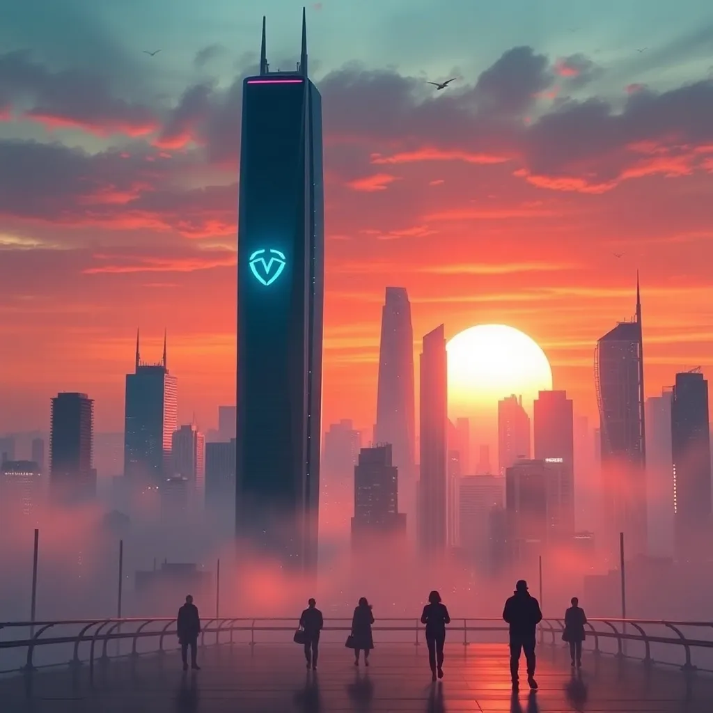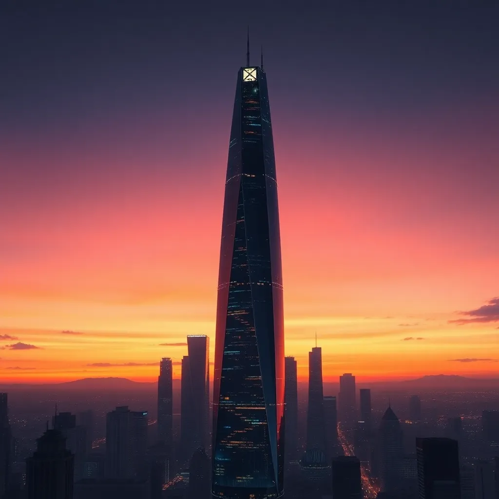 Create a futuristic cityscape at sunset with a sleek skyscraper in the foreground. The building should be transparent, allowing the vibrant city lights and colors to shine through. The background should feature a gradient of oranges, pinks, and purples, with a few wispy clouds and a hint of moonlight.