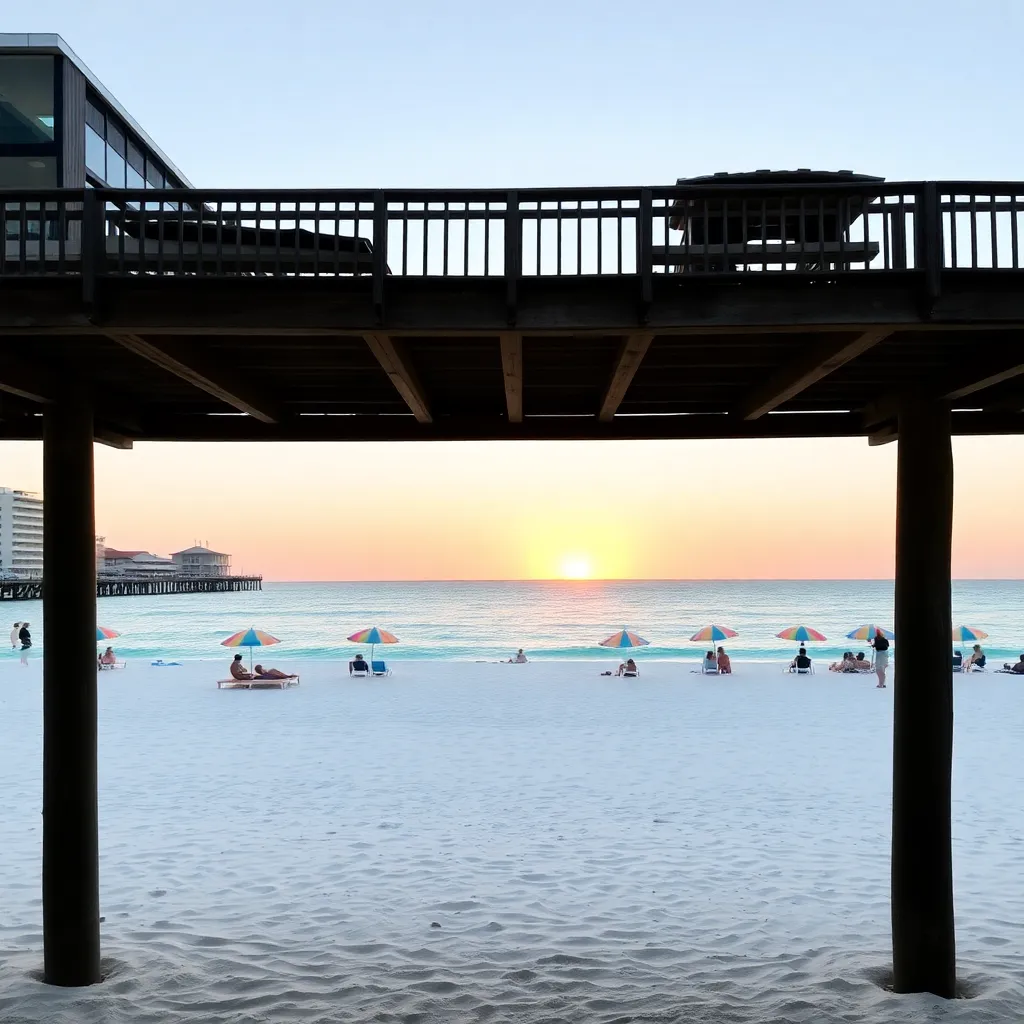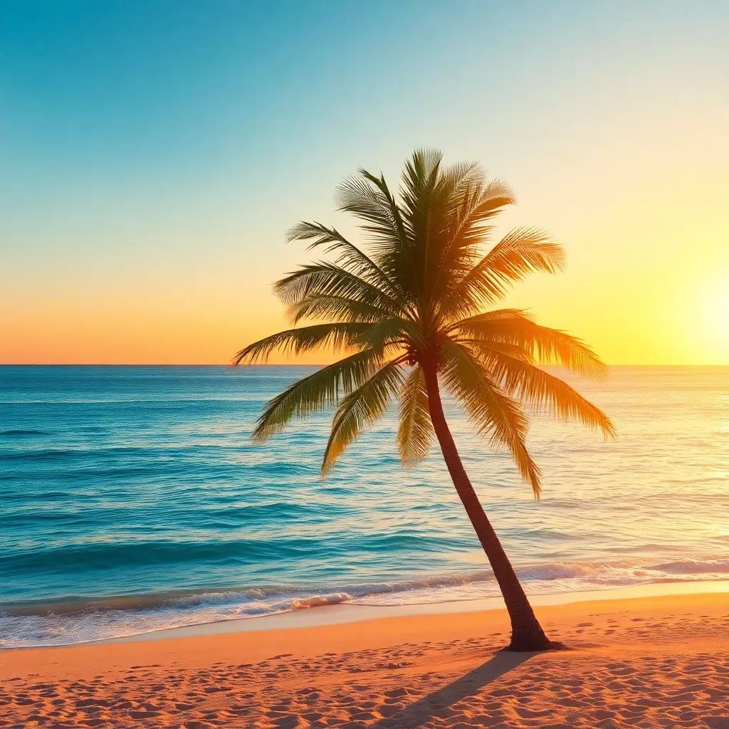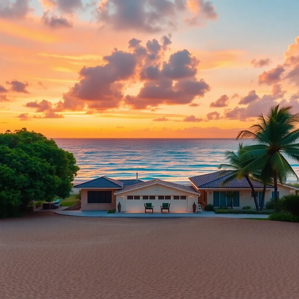 Create a stunning beach sunset with a serene oceanfront villa as the main subject. Remove the distracting background of lush greenery and replace it with a warm, golden sandy beach, complete with palm trees and a few beachgoers in the distance. Enhance the colors and details for a breathtaking result.
