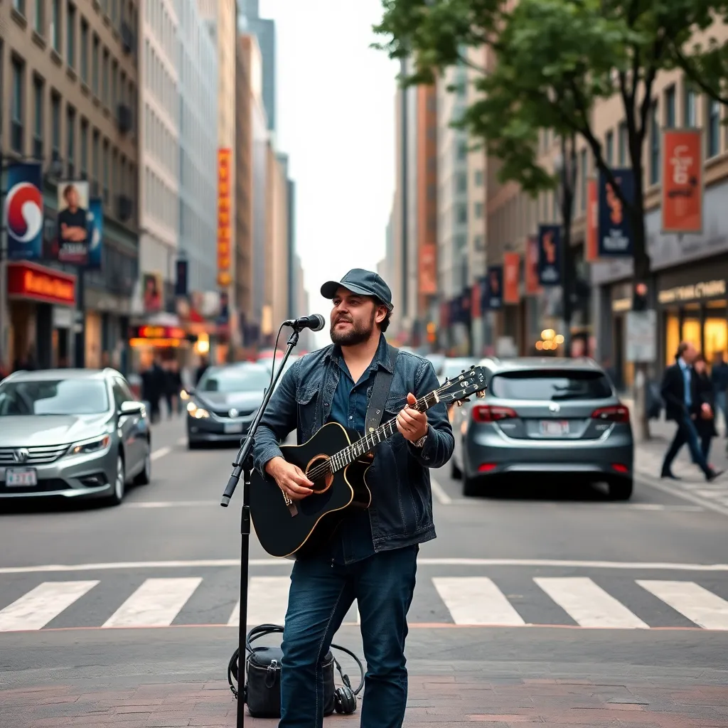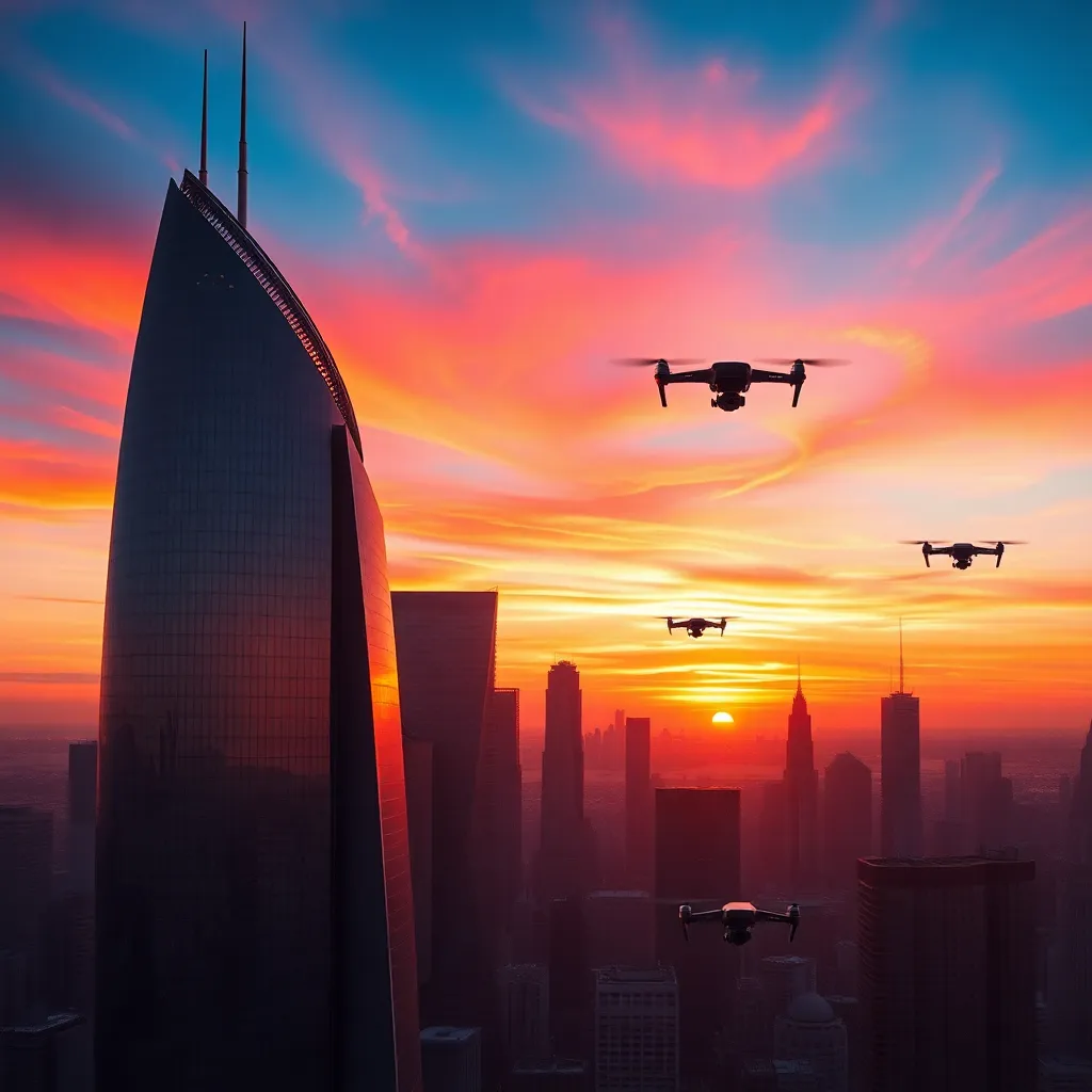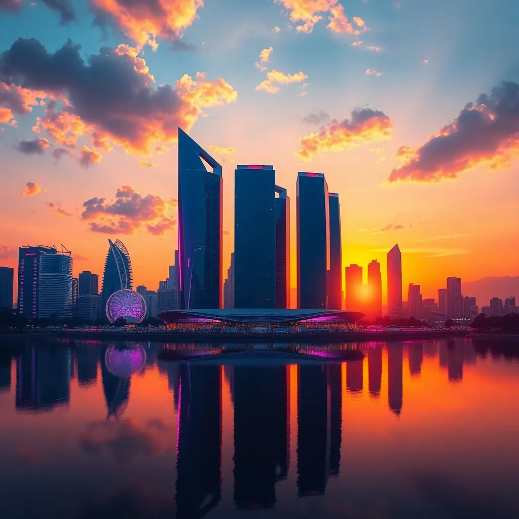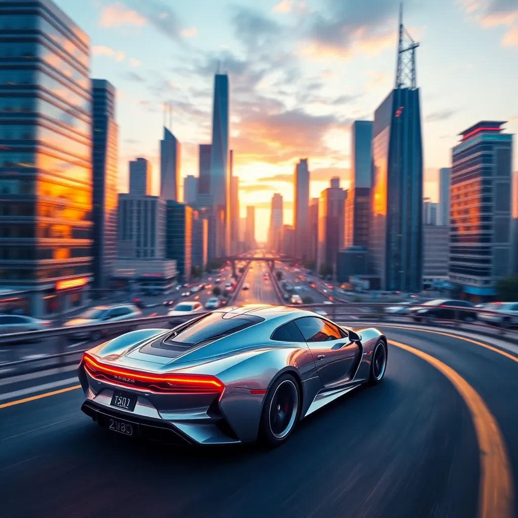 Create a stunning AI-generated image of a futuristic cityscape at sunset. The main subject is a sleek, silver sports car driving down a winding road, with the city's towering skyscrapers and bustling streets blurred out in the background. Incorporate vibrant colors and subtle gradient effects to enhance the scene's drama.