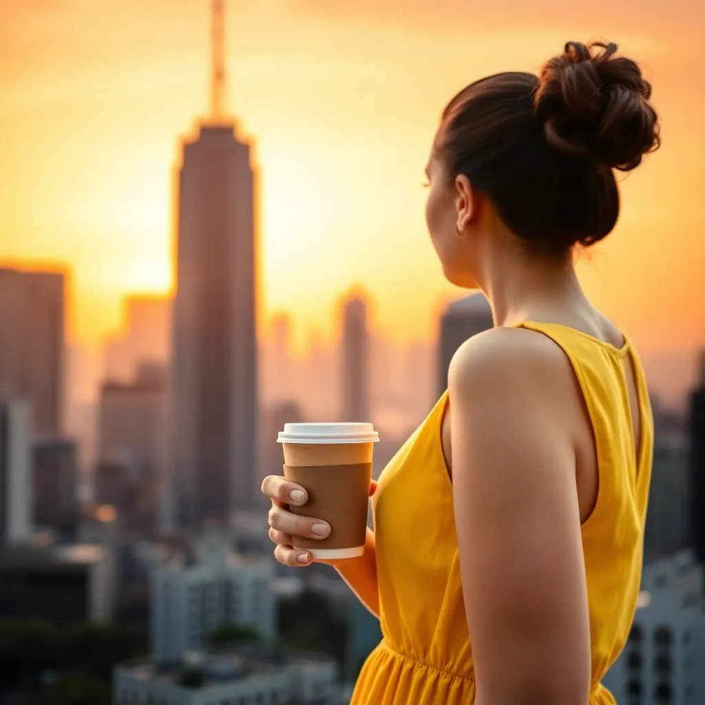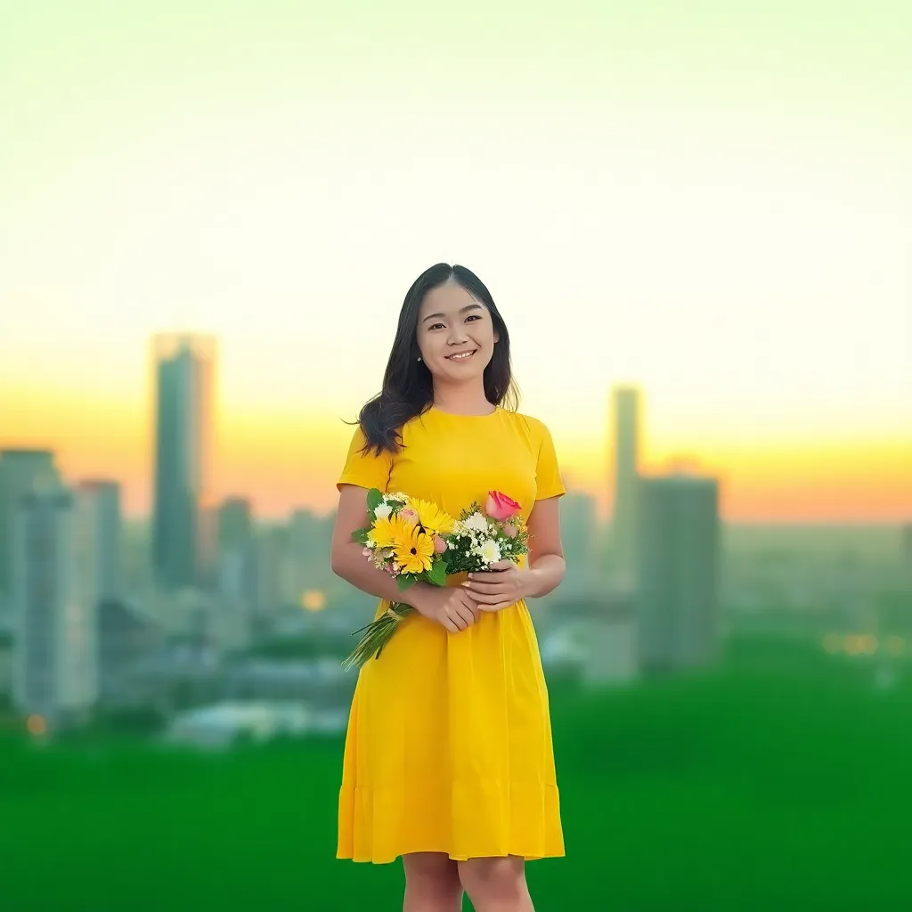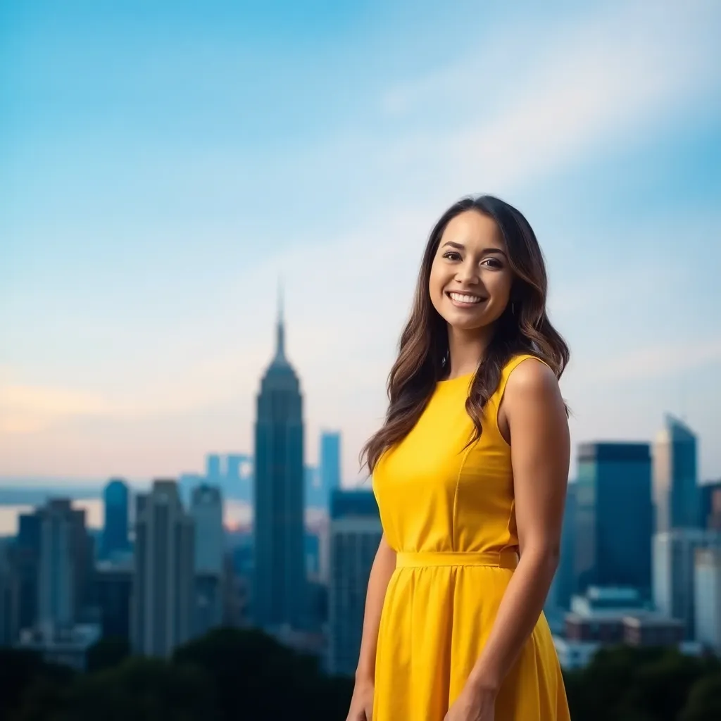 Remove the blue background from a photo of a smiling woman wearing a yellow dress and standing in front of a city skyline. Keep the woman's dress and face intact, and replace the background with a soft, gradient-style texture resembling a sunset. Ensure the image is high-resolution and visually appealing.