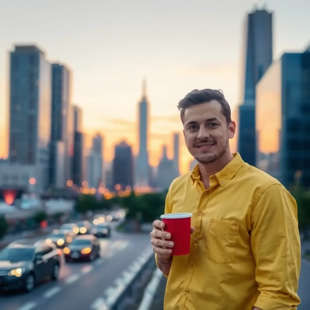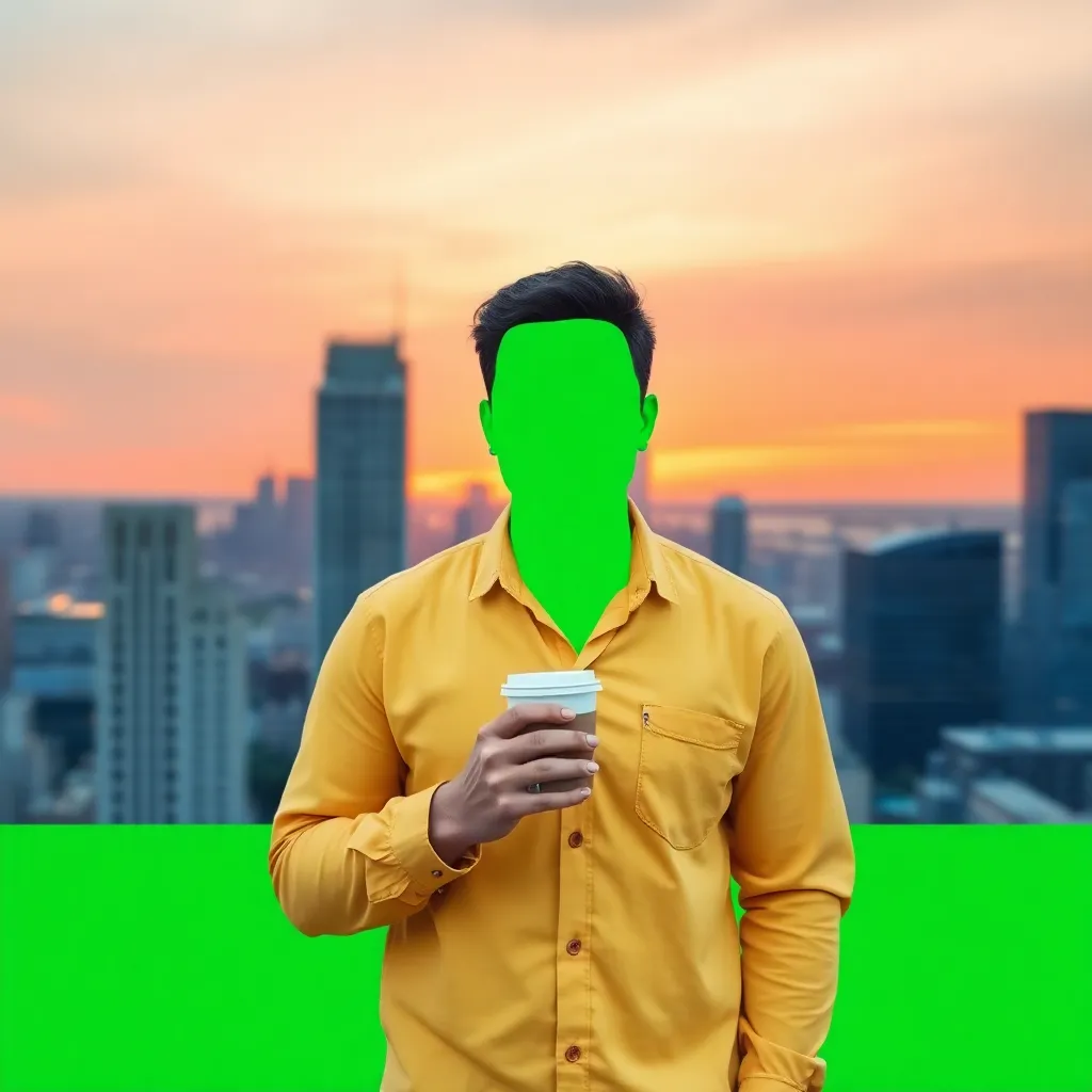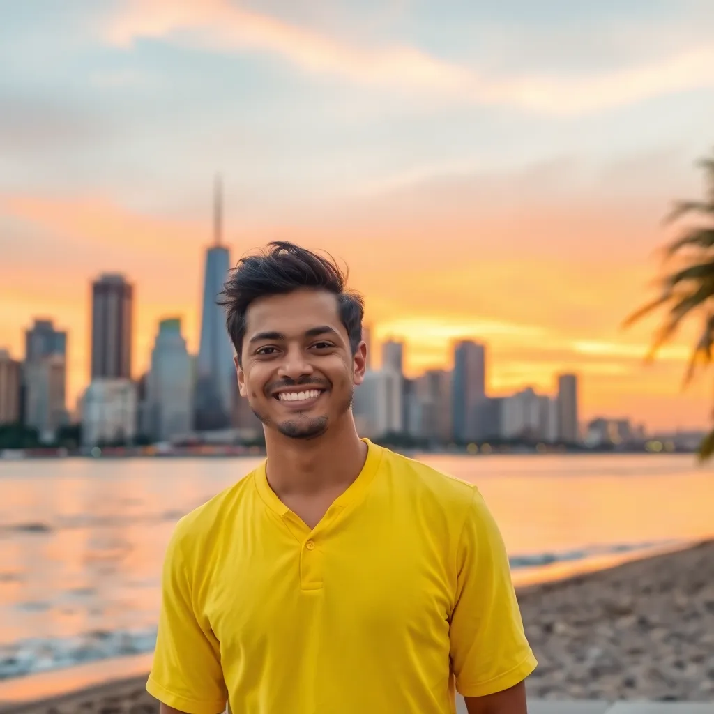 Remove the blue background from a photo of a smiling woman wearing a yellow dress and standing in front of a city skyline. Keep the woman's dress and face intact, and replace the background with a soft, gradient-style texture resembling a sunset. Ensure the image is high-resolution and visually appealing.