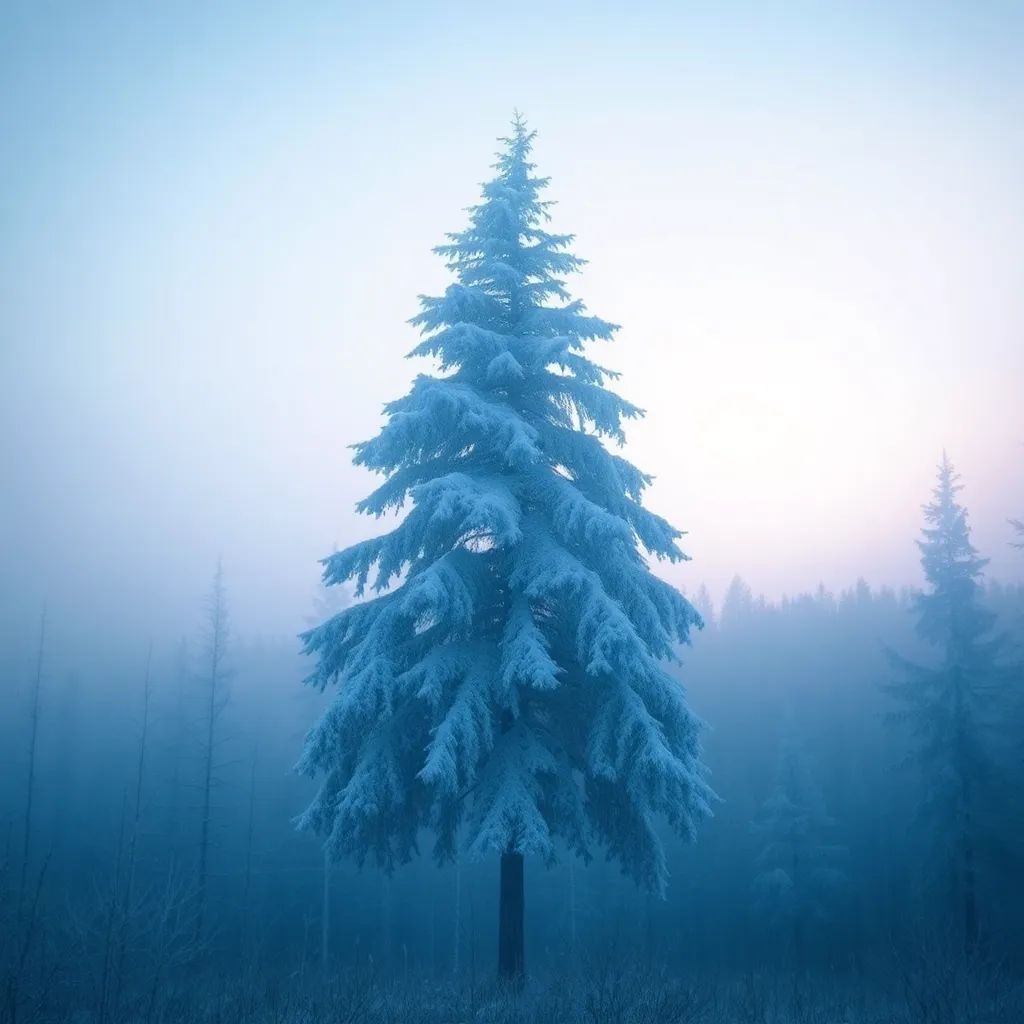 Create a stunning digital art piece by removing the background from a serene winter landscape. Focus on a majestic snow-covered tree standing tall amidst a misty forest, with a subtle gradient of blue and purple hues in the sky. Use AI to erase the surrounding environment, leaving only the tree's silhouette.