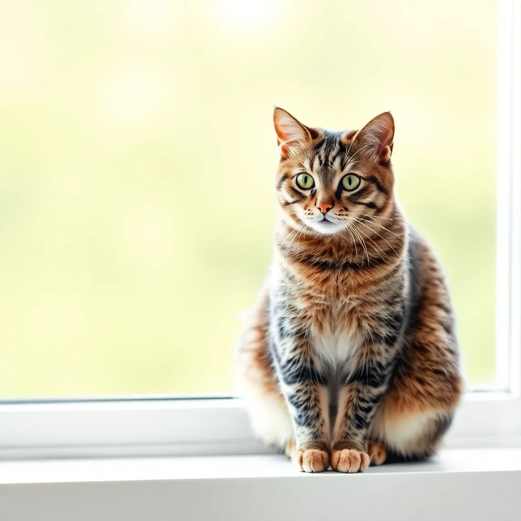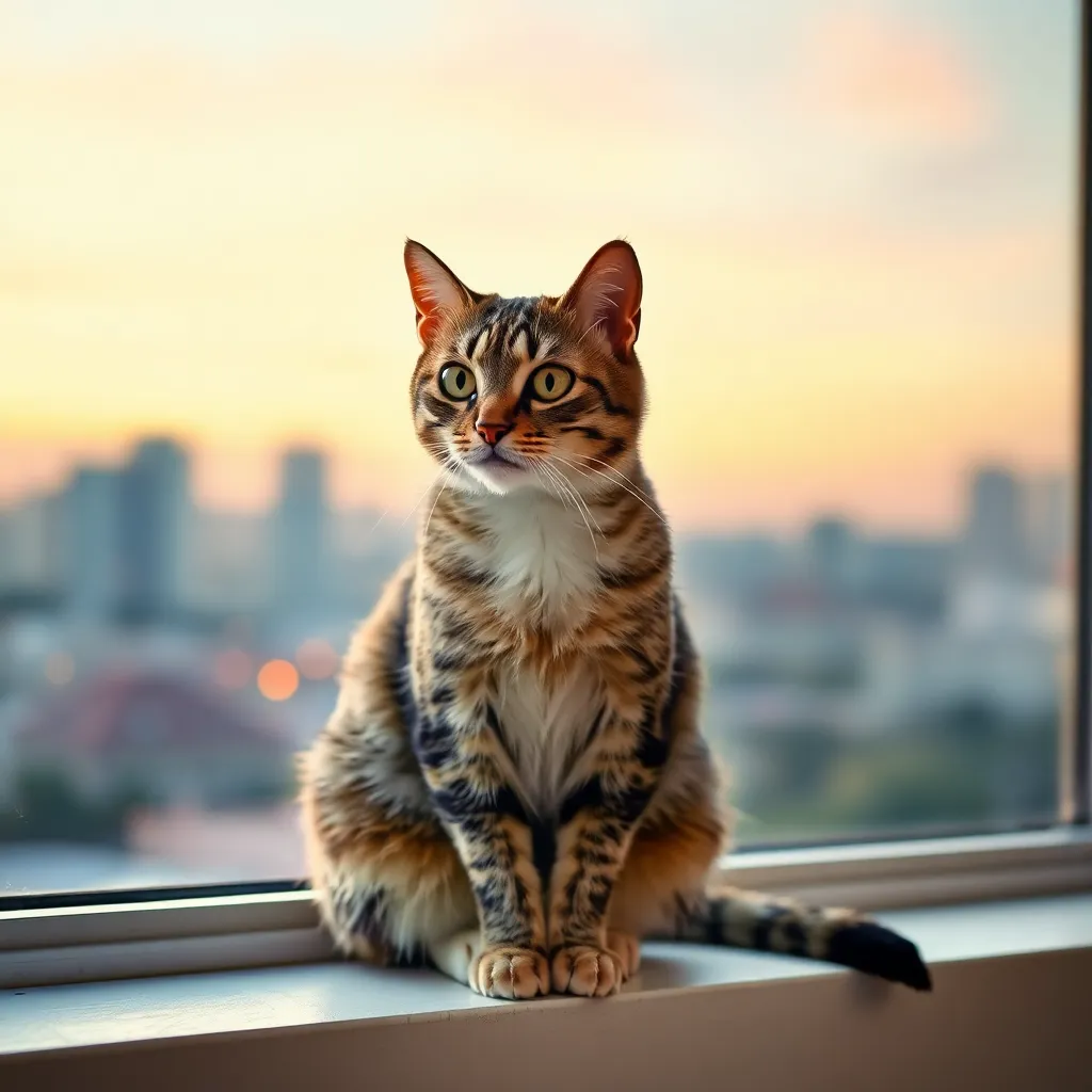 Remove the green background from a photo of a cat sitting on a windowsill, with the cat's fur and whiskers having a subtle gradient effect. Use a realistic and natural-looking replacement background with a blurred cityscape at sunset. Keep the cat's texture and details intact, with a slight depth of field effect.