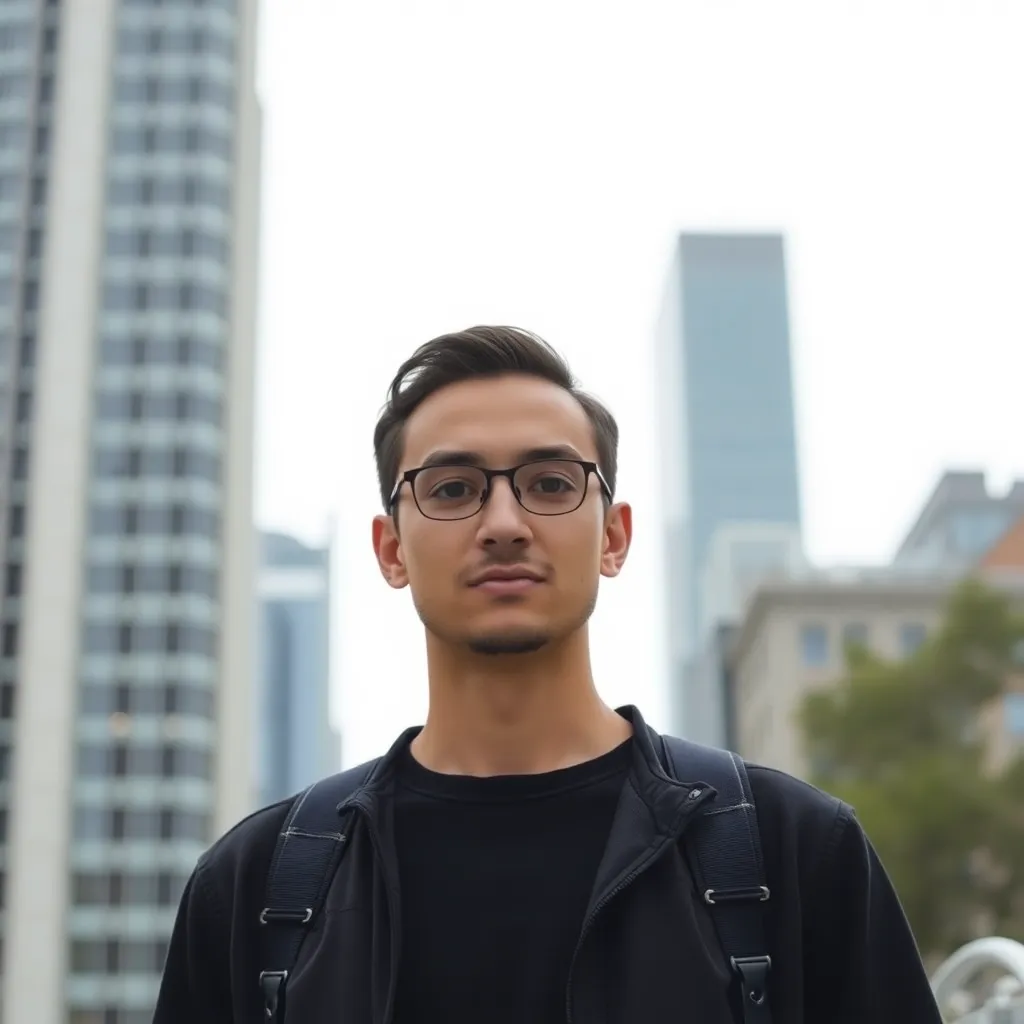 Remove the distracting city background from this photo of a person standing in front of a tall building. Keep the person in focus and remove the blurred cityscape, leaving a clean and minimalist image with a simple gray or white background. Use AI to enhance the subject's features and create a stunning portrait.