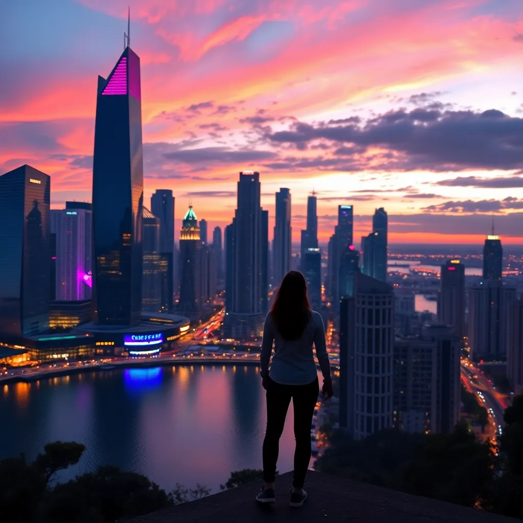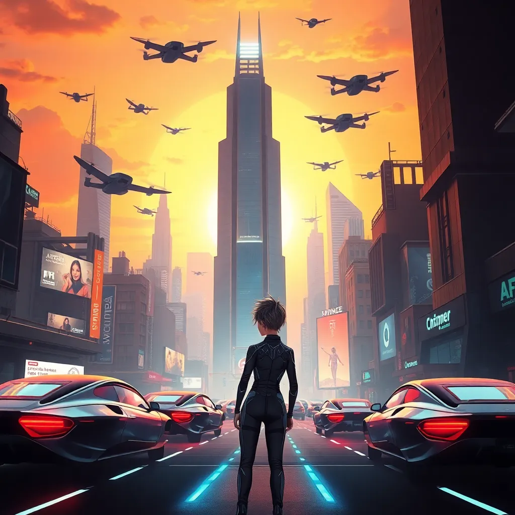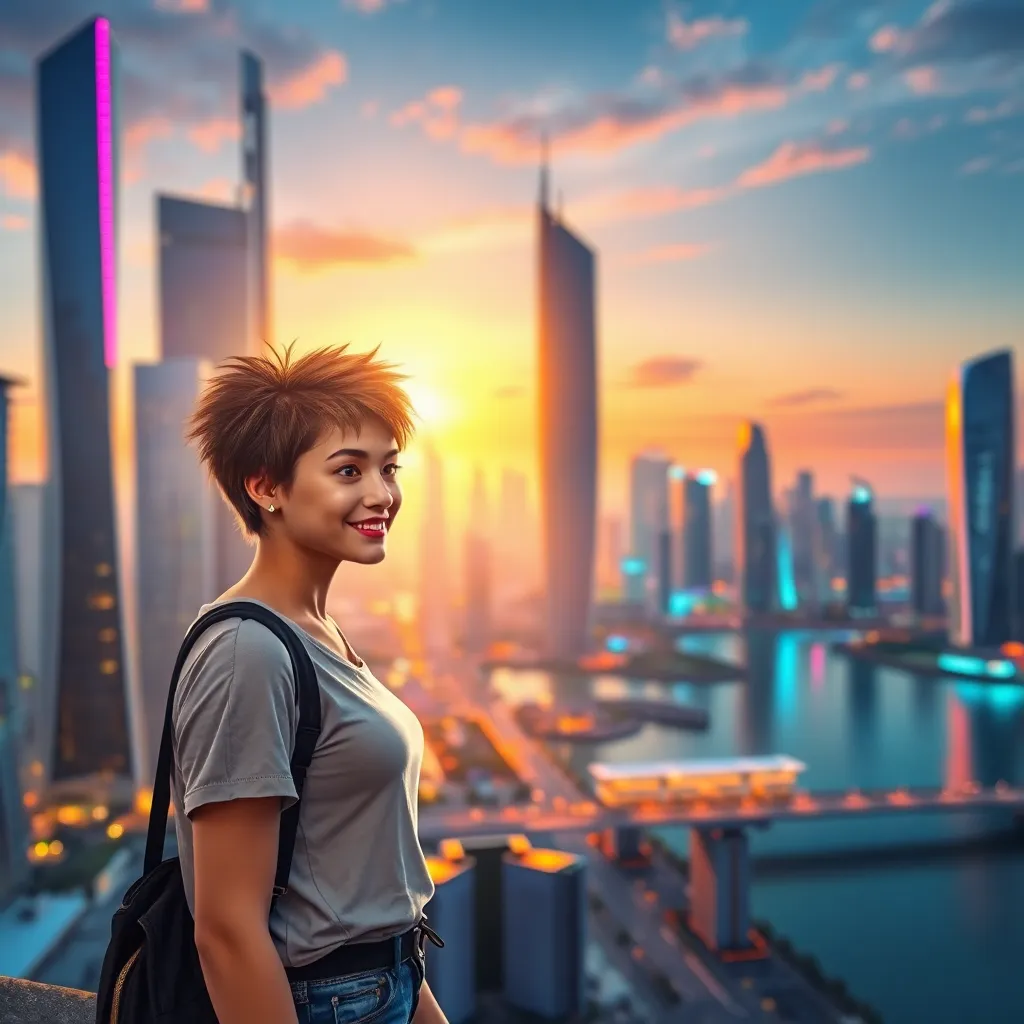 Create a futuristic cityscape at sunset, with a towering skyscraper in the center, surrounded by sleek hovercars and flying drones. Incorporate neon lights and holographic advertisements. In the foreground, a young woman with short, spiky hair and a futuristic jumpsuit stands confidently, looking out at the cityscape.