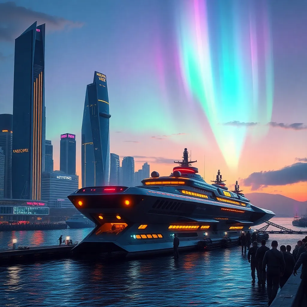 Create a futuristic cityscape at sunset, with sleek skyscrapers and neon lights reflecting off the water. Incorporate a majestic spaceship docked in the harbor, with a group of robots and humans gathered around it, celebrating a historic intergalactic discovery. Add a touch of magic with a rainbow-colored aurora borealis in the sky.