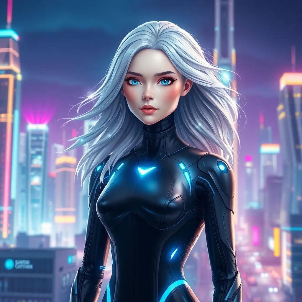 Imagine a futuristic cityscape with a vibrant, neon-lit skyline. In the center, a stunning AI-powered humanoid robot, 'Echo', stands tall with flowing silver hair and piercing blue eyes. She's dressed in a sleek black jumpsuit, with glowing blue accents and a subtle aura of electricity surrounding her. Create a captivating image of Echo in this futuristic metropolis.