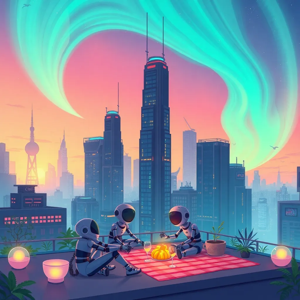 Create a serene digital landscape featuring a futuristic cityscape at sunset, with towering skyscrapers and lush greenery. Incorporate a romantic figure, perhaps a humanoid robot, standing on a rooftop, gazing out at the breathtaking view with a thoughtful expression. Soft, pastel hues and subtle lighting would be ideal.