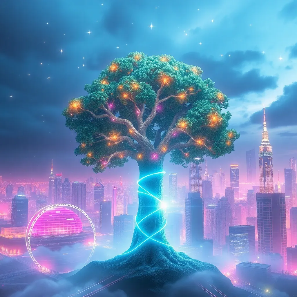 Create a whimsical illustration of a futuristic cityscape at sunset, with towering skyscrapers and sleek architecture. Incorporate a prominent central square with a giant, glowing tree and a bustling street market. The atmosphere should be vibrant and lively, with a hint of neon lights and futuristic technology.