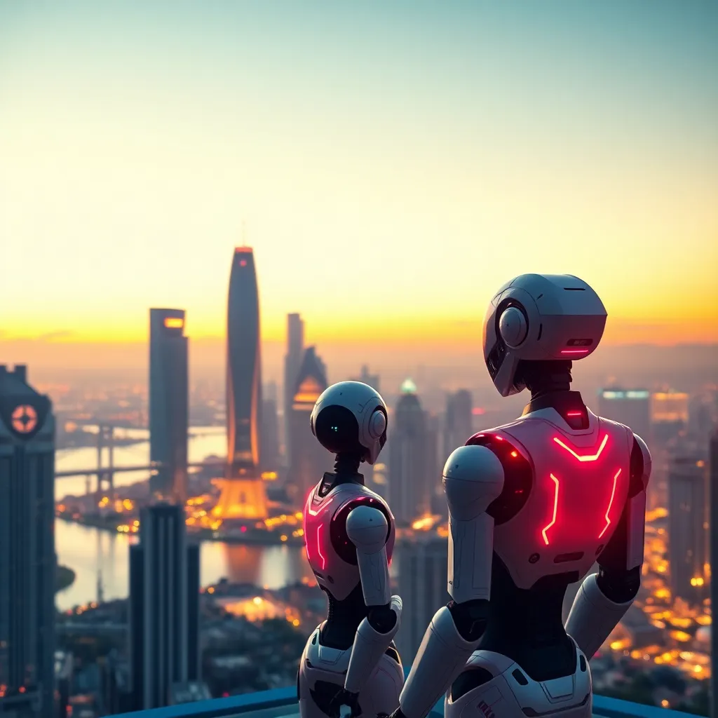 Create an image of a futuristic cityscape at sunset, with sleek skyscrapers and neon lights reflecting off the water. In the foreground, a stylish AI-powered robot couple, 'Aurora' and 'Nova', are standing on the edge of the city, gazing out at the breathtaking view, with a subtle glow surrounding them.
