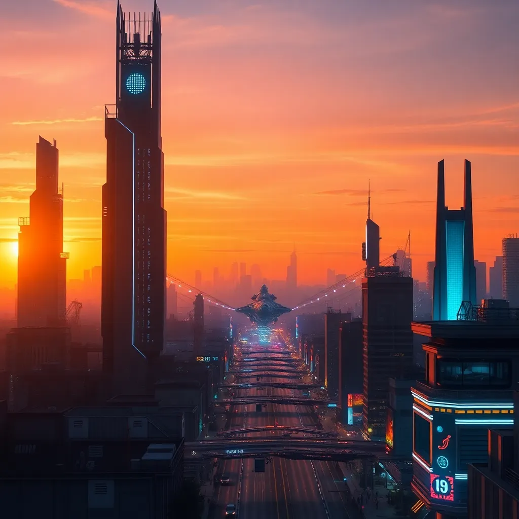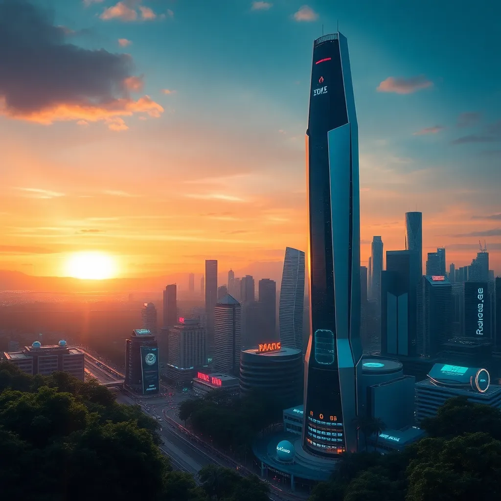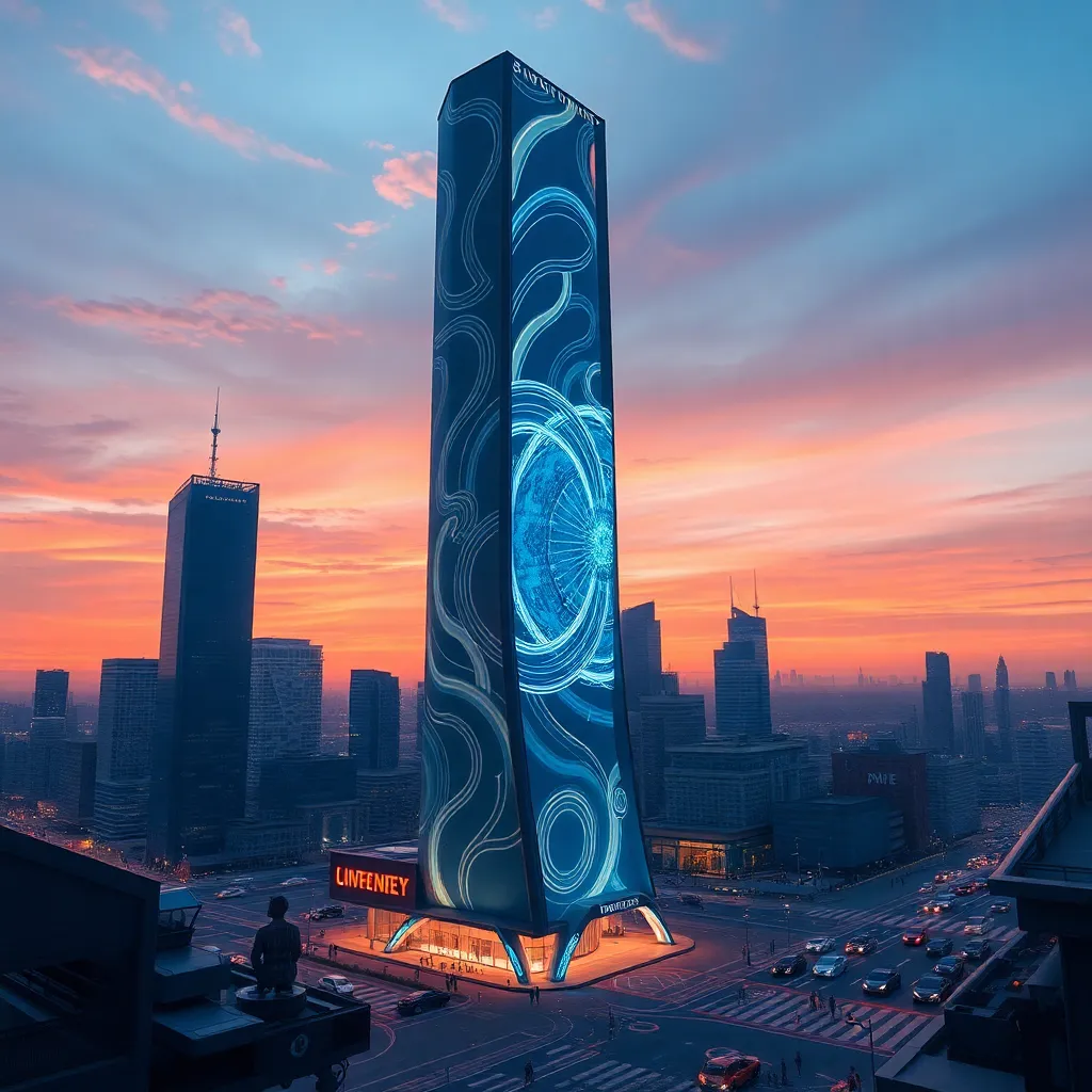 Imagine a futuristic cityscape at sunset, with a sleek, neon-lit skyscraper in the center. The building's exterior is covered in swirling patterns of light, and a holographic display projects a stunning AI-generated art piece onto the side of the building. The surrounding city is bustling with futuristic cars and pedestrians.