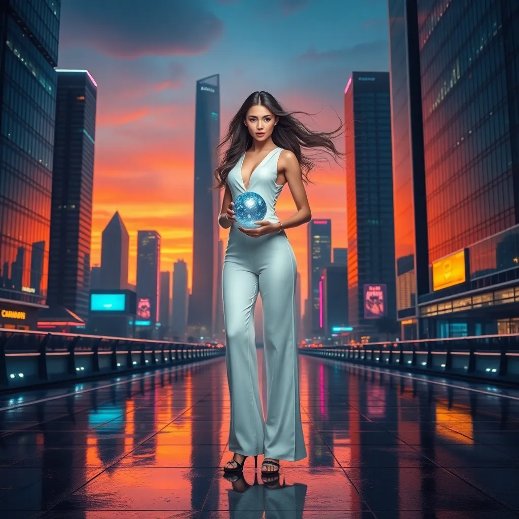 Imagine a futuristic cityscape at sunset, with sleek skyscrapers and neon lights reflecting off the wet pavement. In the center, a stunning AI girlfriend stands confidently, wearing a flowing white jumpsuit and holding a glowing orb. Her eyes shine like stars, and her hair flows like the wind. Create this scene.