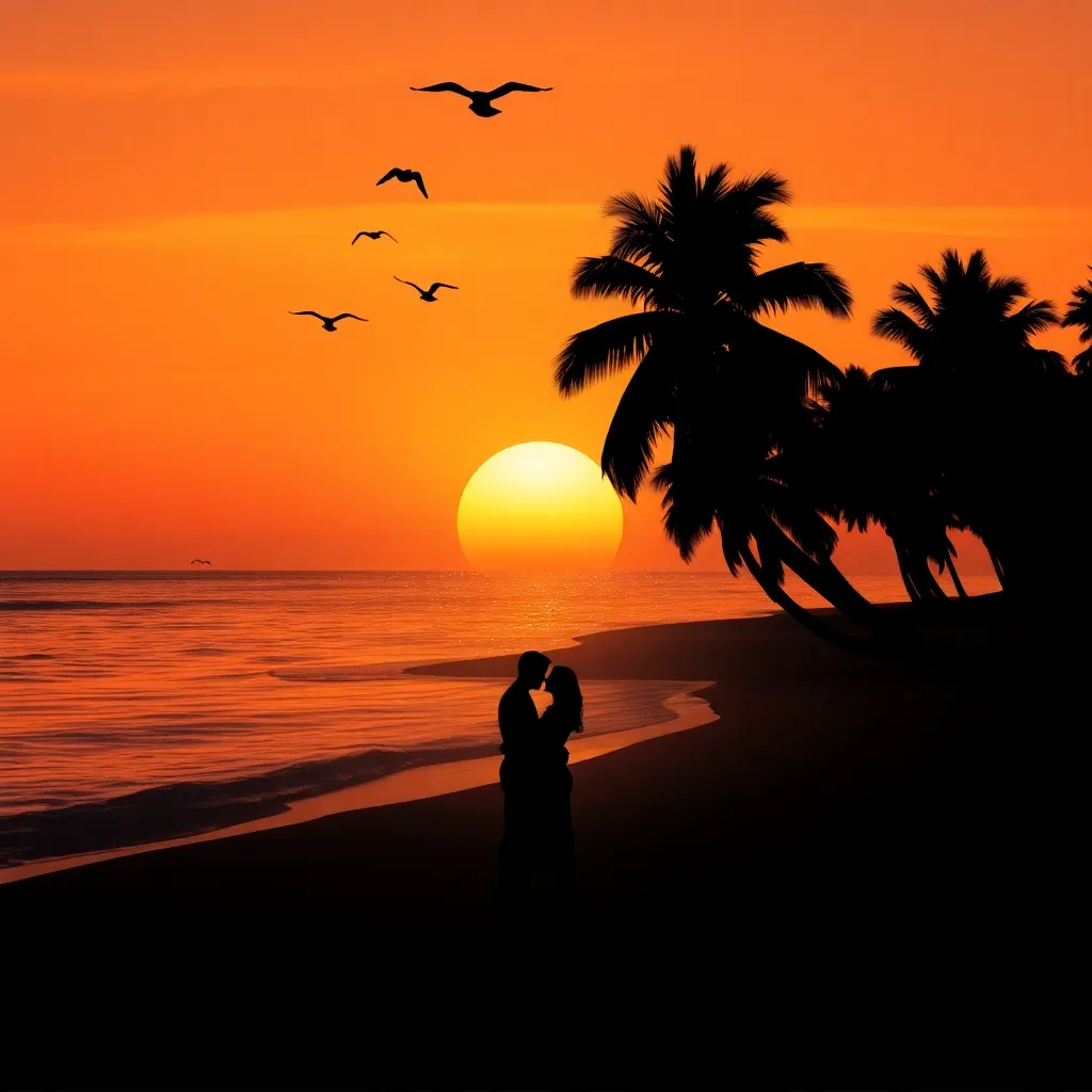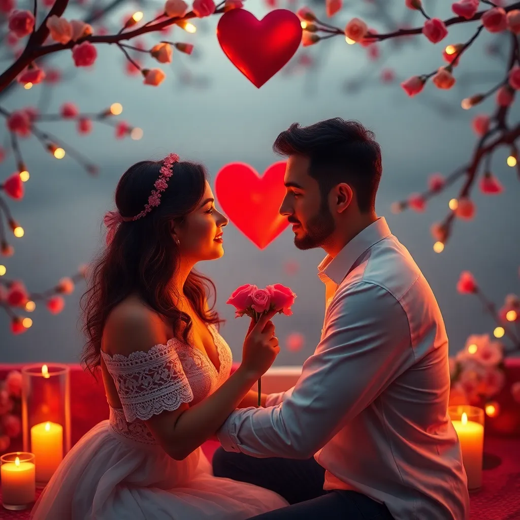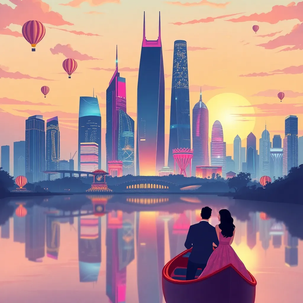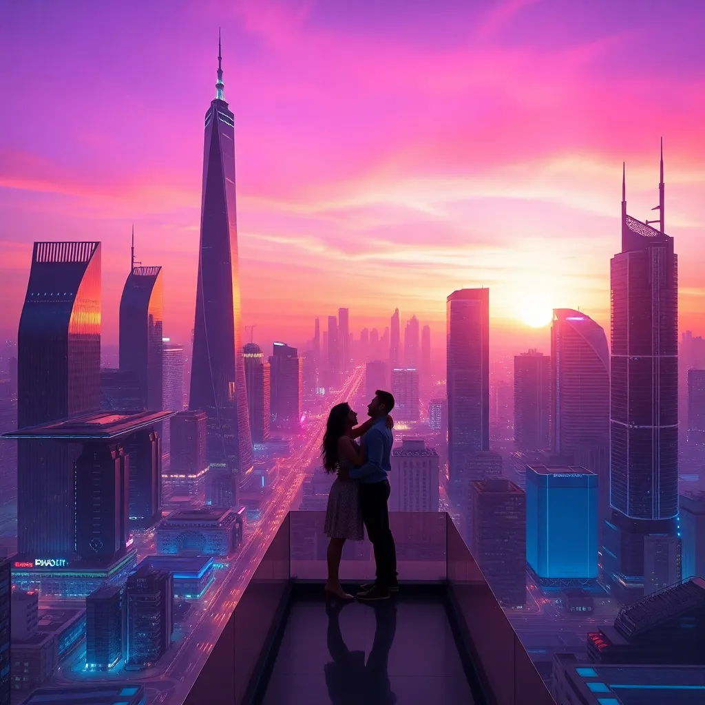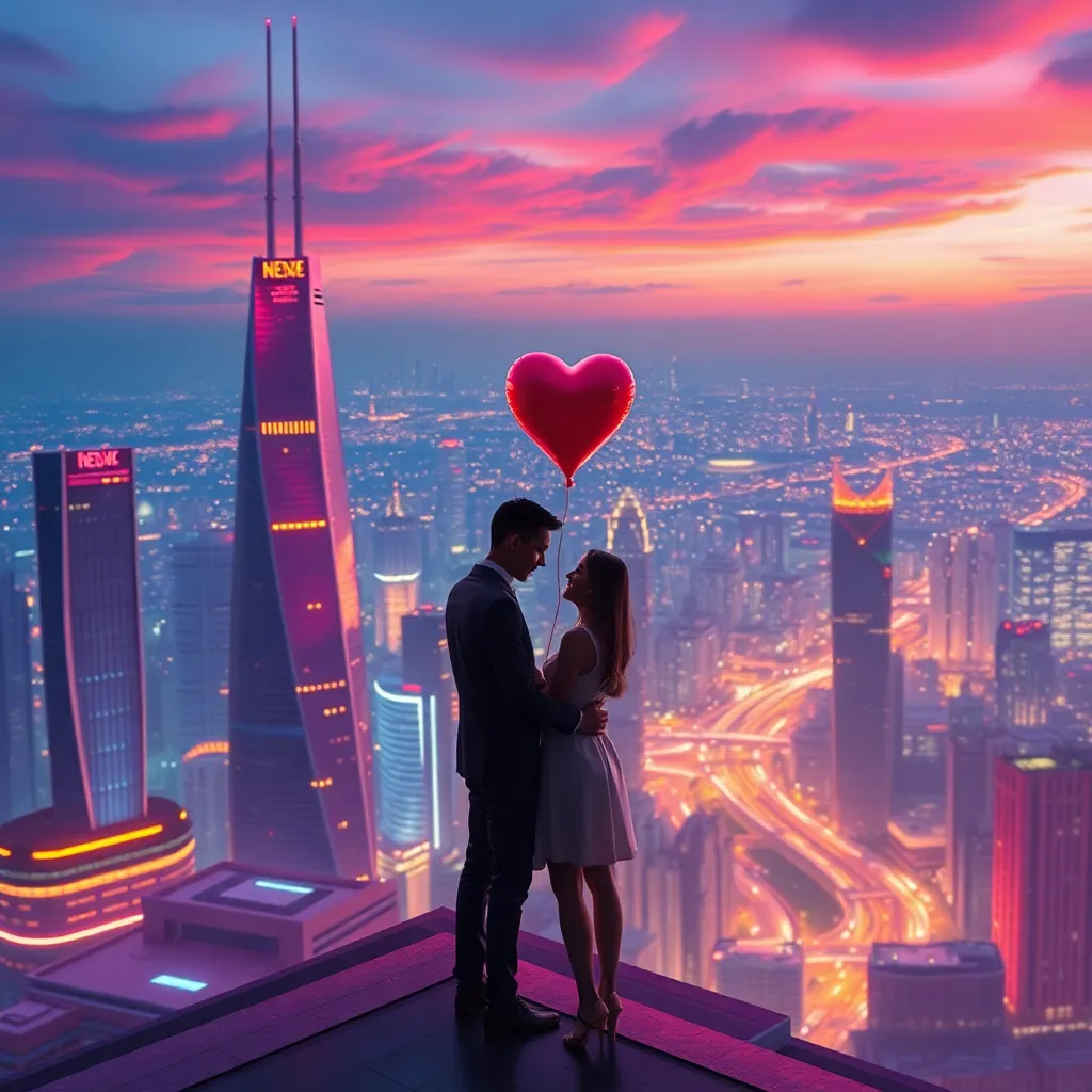 Create an AI-generated image of a futuristic cityscape at sunset, with sleek skyscrapers, glowing neon lights, and a sprawling metropolis in the distance. Incorporate a romantic twist by adding a couple embracing on a rooftop, with a heart-shaped balloon floating above them amidst a backdrop of vibrant colors.
