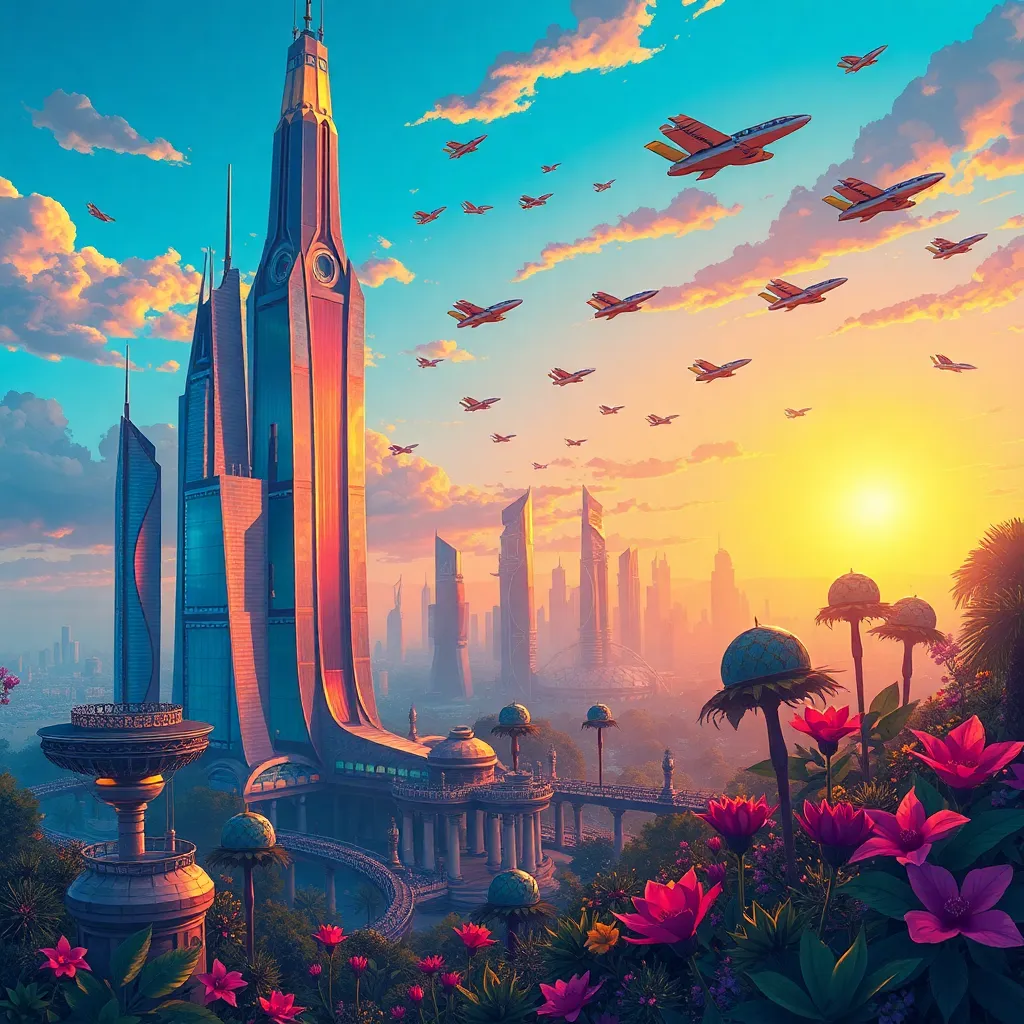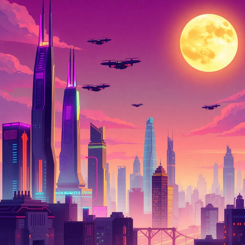 Create a whimsical illustration of a futuristic cityscape at sunset, with sleek skyscrapers, glowing neon lights, and a majestic flying robot soaring above the clouds. Incorporate a sense of movement and energy, with vibrant colors and intricate details. The atmosphere should be both futuristic and dreamy.