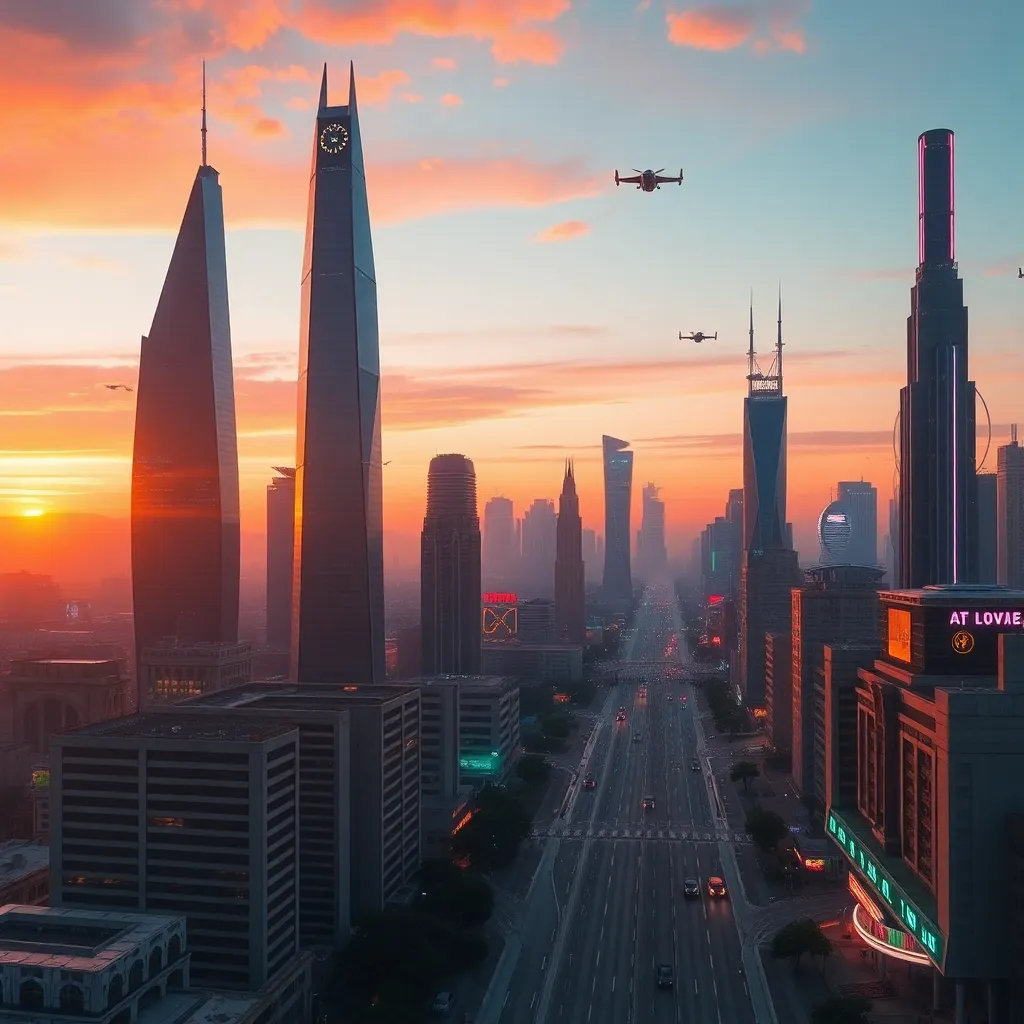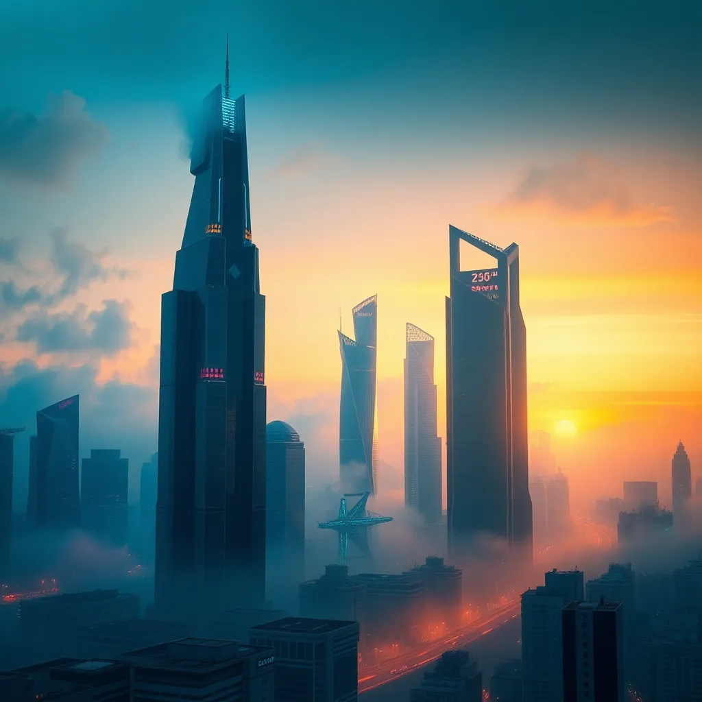 Create an AI-generated image of a futuristic cityscape at sunset, with towering skyscrapers and sleek architecture, surrounded by a misty atmosphere and a hint of neon lights, as if the city is alive and pulsing with energy. Incorporate a subtle blend of blue and orange hues to capture the vibrant atmosphere.