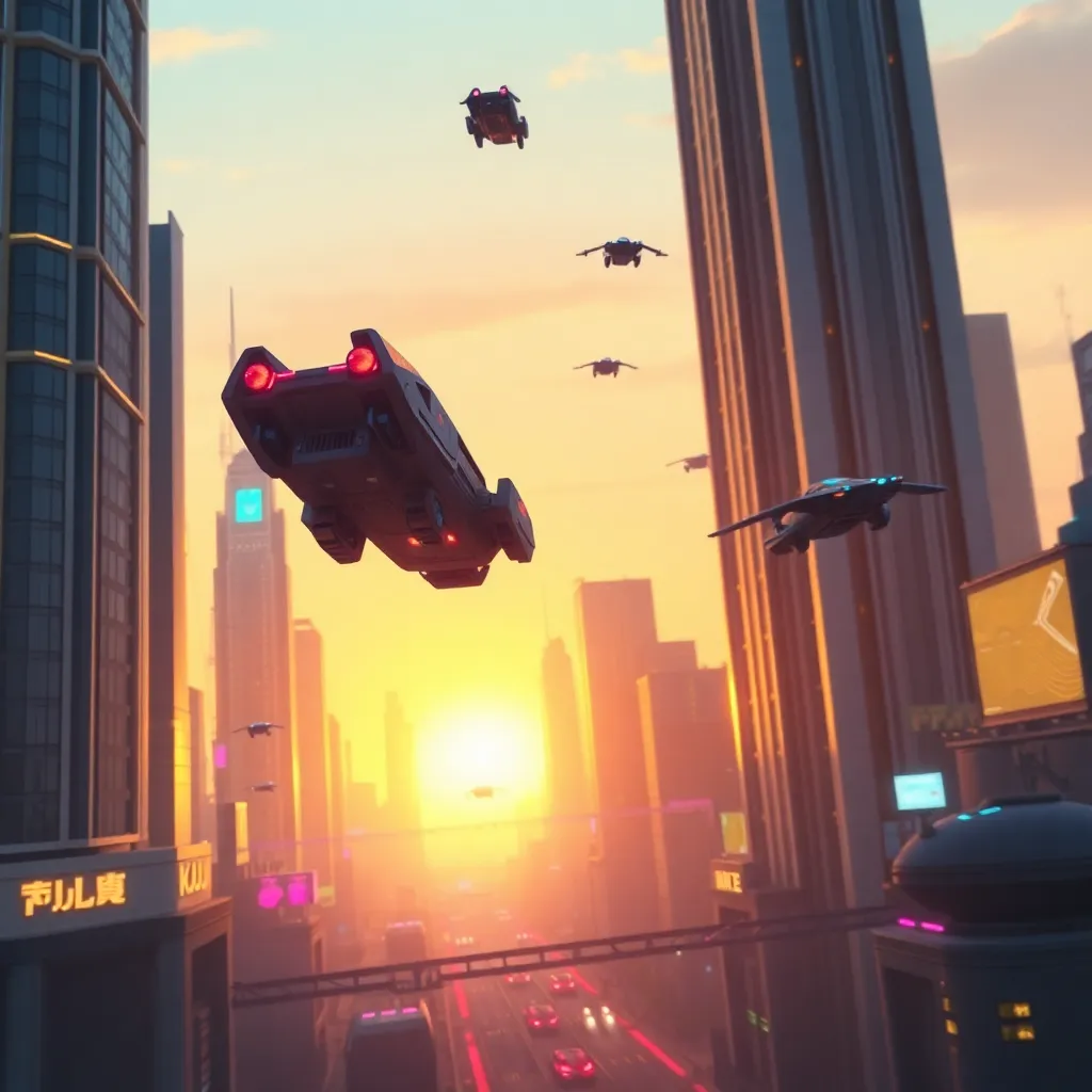 Create an image of a futuristic cityscape at sunset, with sleek skyscrapers, neon lights, and a vibrant atmosphere. Incorporate a sense of movement and energy, with flying cars and hoverbikes zipping through the air. The background should be a warm, golden hue, with a subtle gradient of blues and purples.
