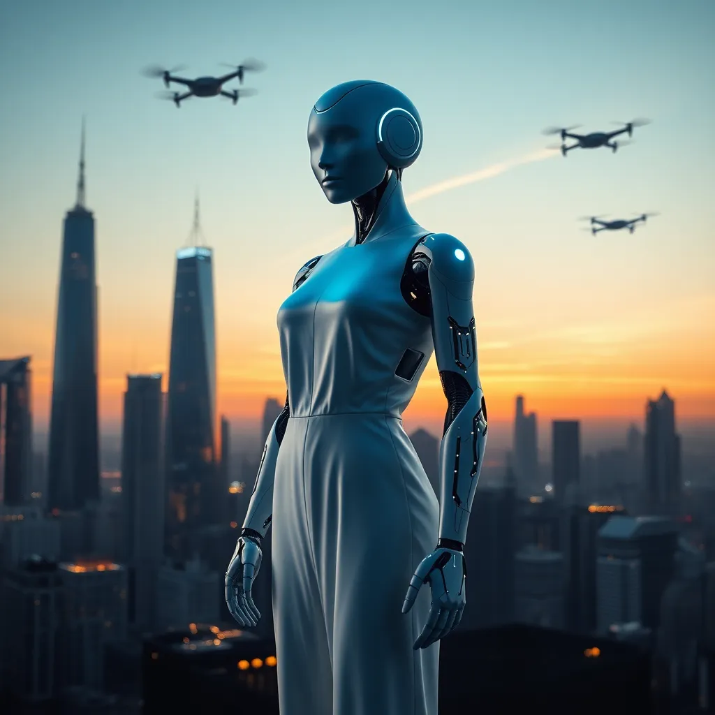 Imagine a futuristic cityscape at sunset, with sleek skyscrapers and hovering drones. In the foreground, a stunning AI-powered humanoid robot, 'Echo', stands confidently, her iridescent skin glowing with a soft blue light. She's dressed in a flowing white jumpsuit, with intricate circuitry patterns etched onto her arms and legs.